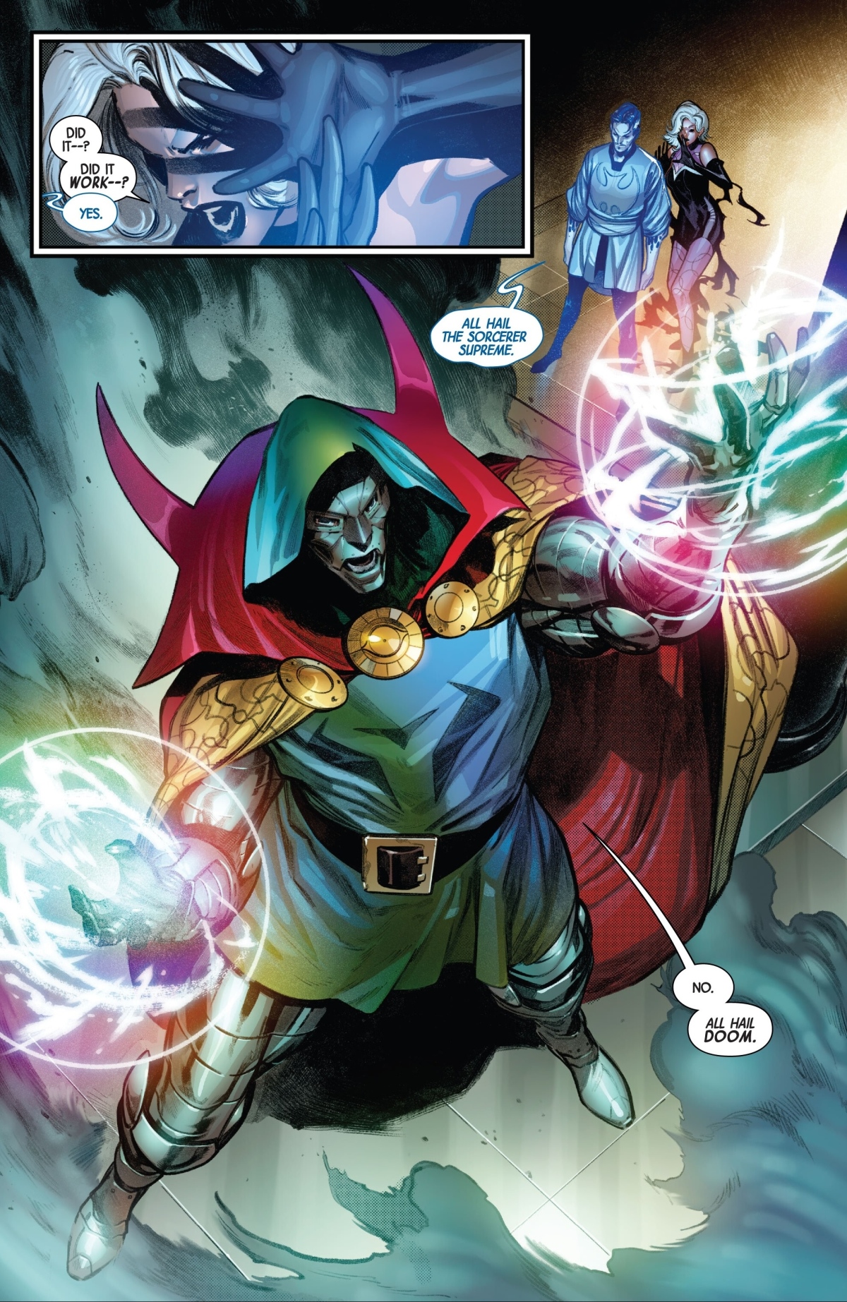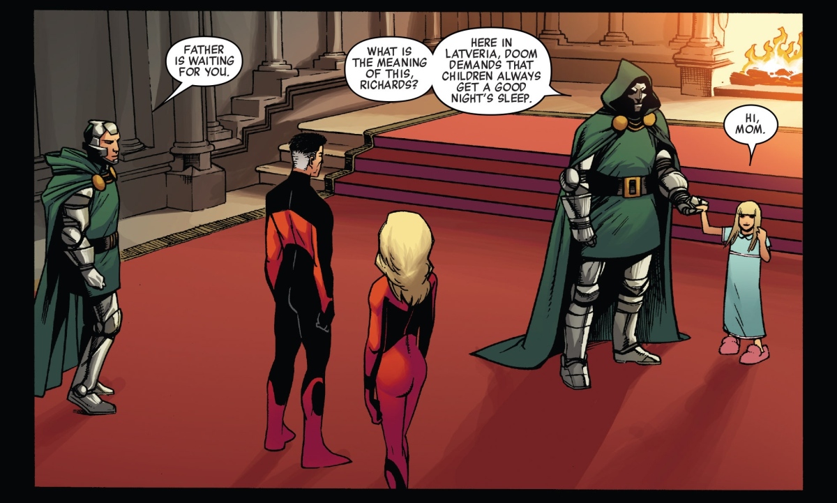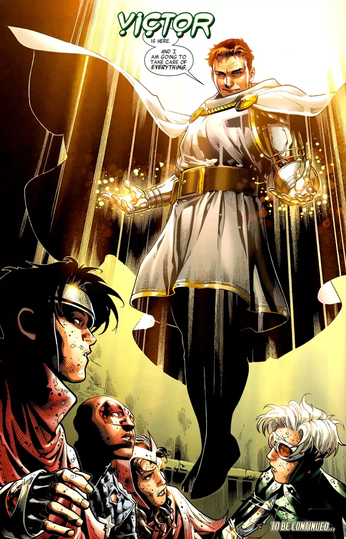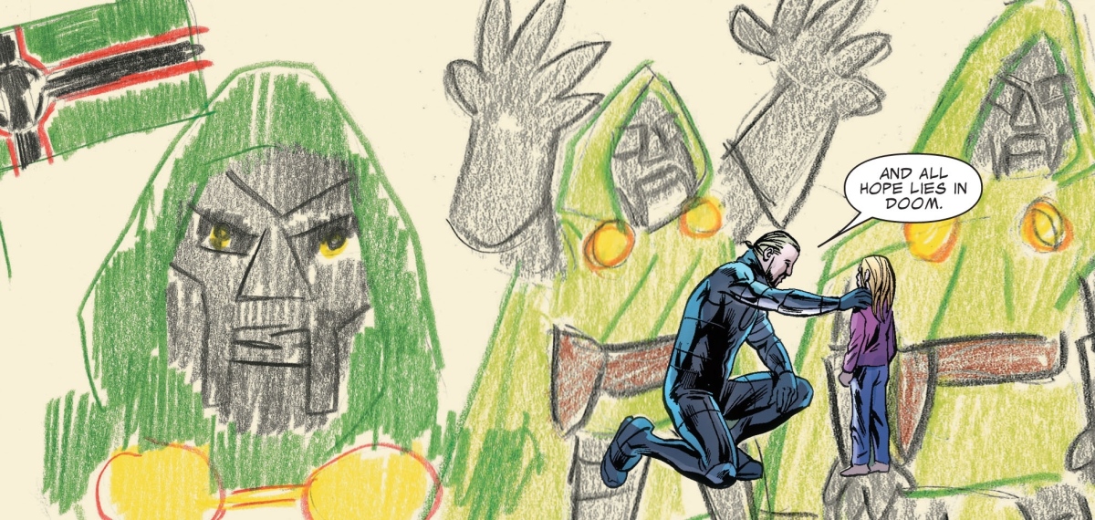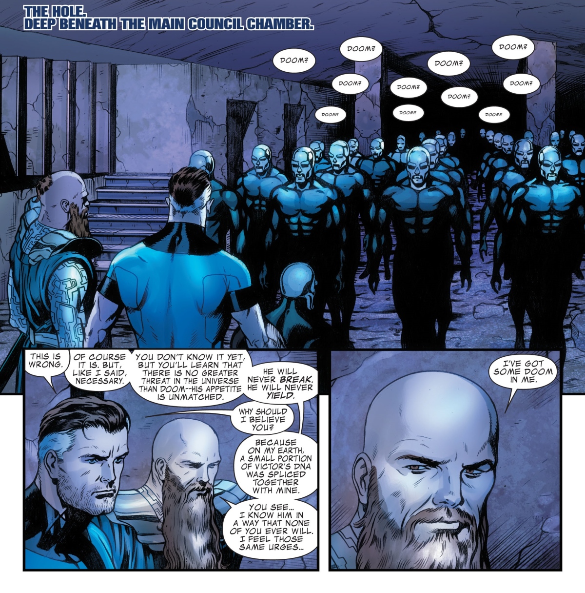 在Victor認輸之後,分子人把力量給了神奇先生控制,於是他動手重建了整個漫威多元宇宙;Victor發現自己回到了老家拉脫維亞,只是在身為末日神君的期間一直無法修復的臉孔,現在居然被Reed修好了。