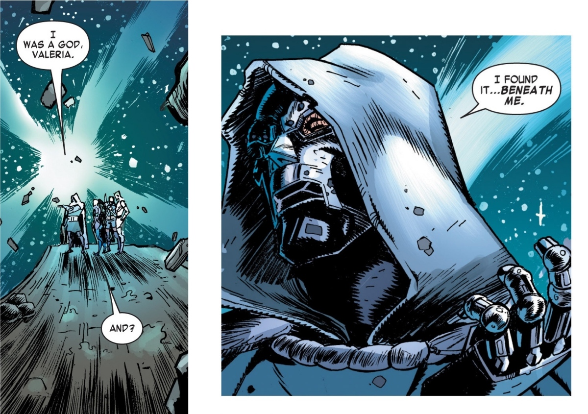沒想到他造出的生命也都跟他一樣冷血無情且充滿野心,馬上就對造物主進行了反叛、奪走了無限寶石並將他囚禁起來。神奇先生、未來Valeria和神奇先生的父親Nathaniel Richards三人一起拼了命才將他成功救出那個宇宙。而末日博士對此的感想只有「神這身分配不上我。」