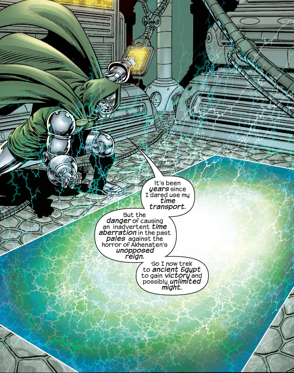 身為漫威宇宙中唯一(可能除去牛頓以外)同時精通科學與魔法的大師,末日博士使用兩者創造了他的時間旅行科技「時間平台(Time Platform)」,或稱「末日鎖(Doomlock)」。這項科技讓他可以隨意穿越時間去改變歷史,不受漫威宇宙的時間法則——改變過去只會創造平行的新未來,而非改變你自己的未來——所困。