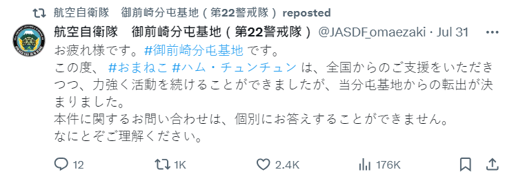 沒想到「おまねこ 」走紅約一年的時間,帶動不少軍方宣傳與關注度,卻在前日 ( 7/31 )宣布,該吉祥物將會離開「御前崎基地」,目前無法揭露未來這角色是否會存在航空自衛隊體系,讓不少粉絲與網友難過不已,希望這角色可以繼續下去。