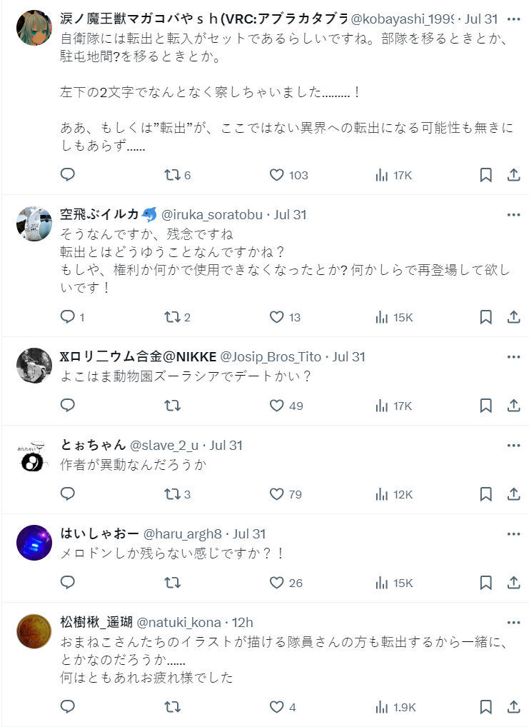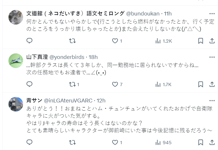 由於官方公告並沒有清楚解釋,不少網友粉絲感到扼腕,如此優秀對自衛隊有功的吉祥物,不知道能不能保留下來,繼續讓這個角色能被自衛隊使用並繼續擔當職位。