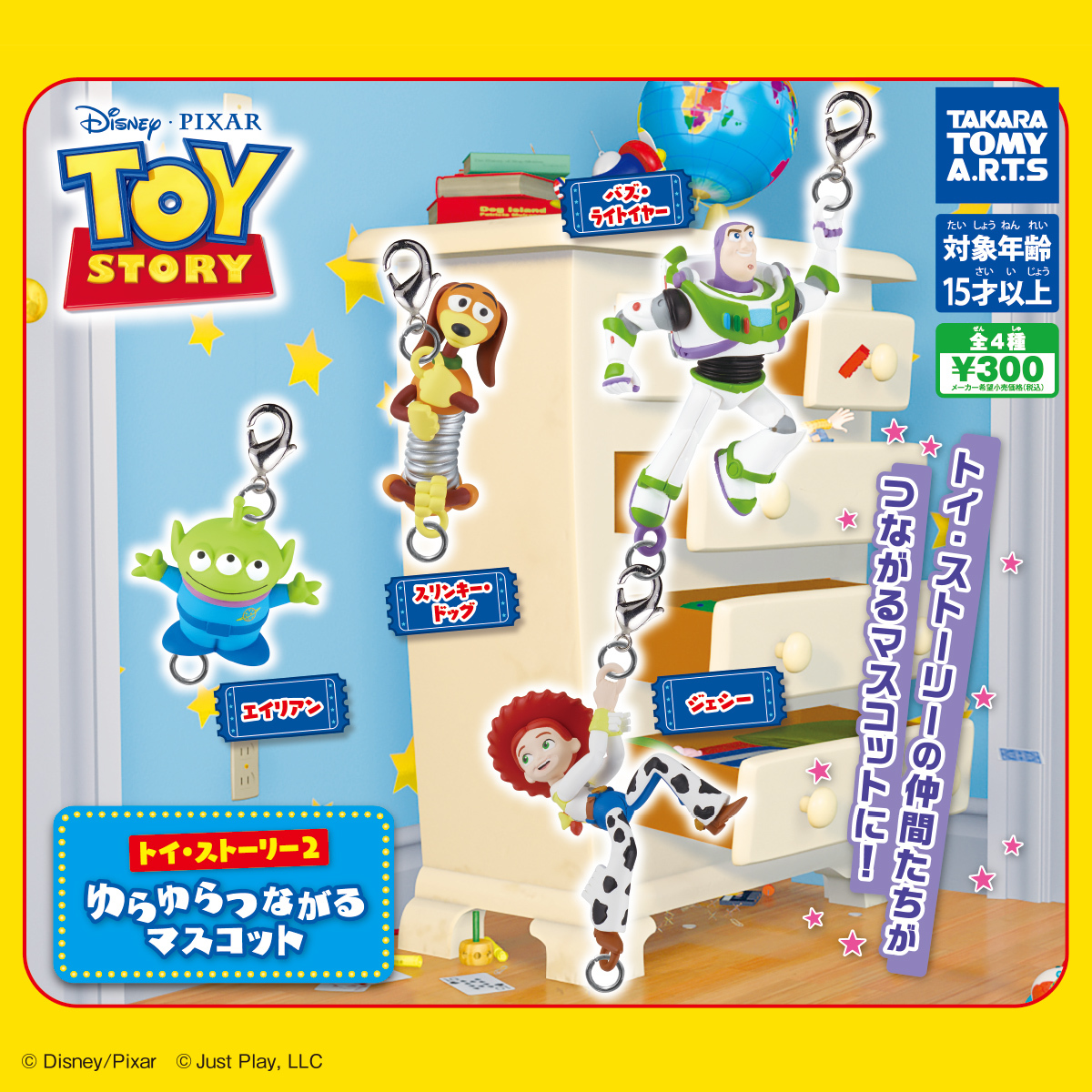 T-ARTS 的「連結角色吊飾」(ゆらゆらつながるマスコット)系列將各種 IP 的角色製作為能夠透過鉤環串連的可愛吊飾,推出過喜拿、史努比等不同主題的轉蛋商品。在先前的「《玩具總動員 4》連結角色吊飾」推出胡迪、牧羊女寶貝等角色後,這次以 1999 年的續集《玩具總動員 2》為主題,推出巴斯光年、翠絲、彈簧狗以及三眼怪四款造型,為每個角色製作出懸掛騰空的動態,將吊飾串連起來便會有一個牽著一個的視覺效果,更可以搭配前一彈的商品一起串連,湊成更長的吊飾鍊!