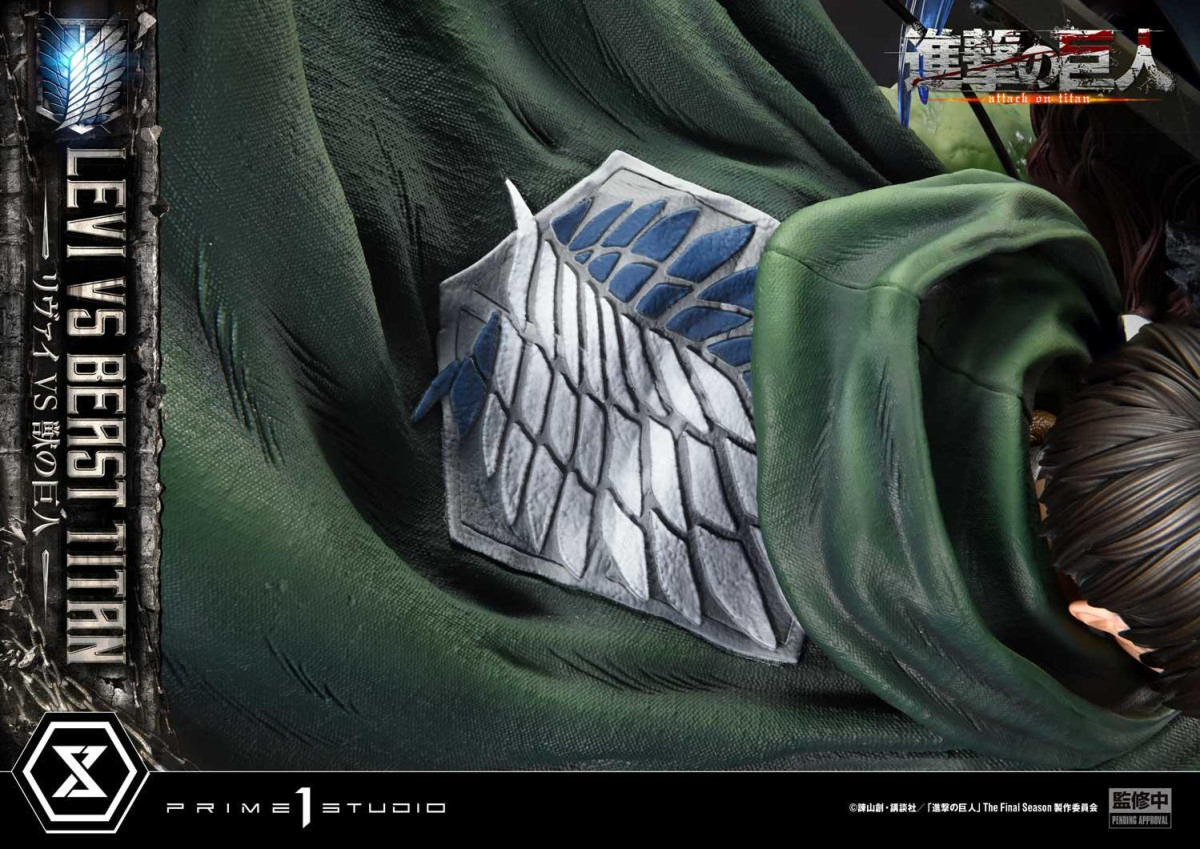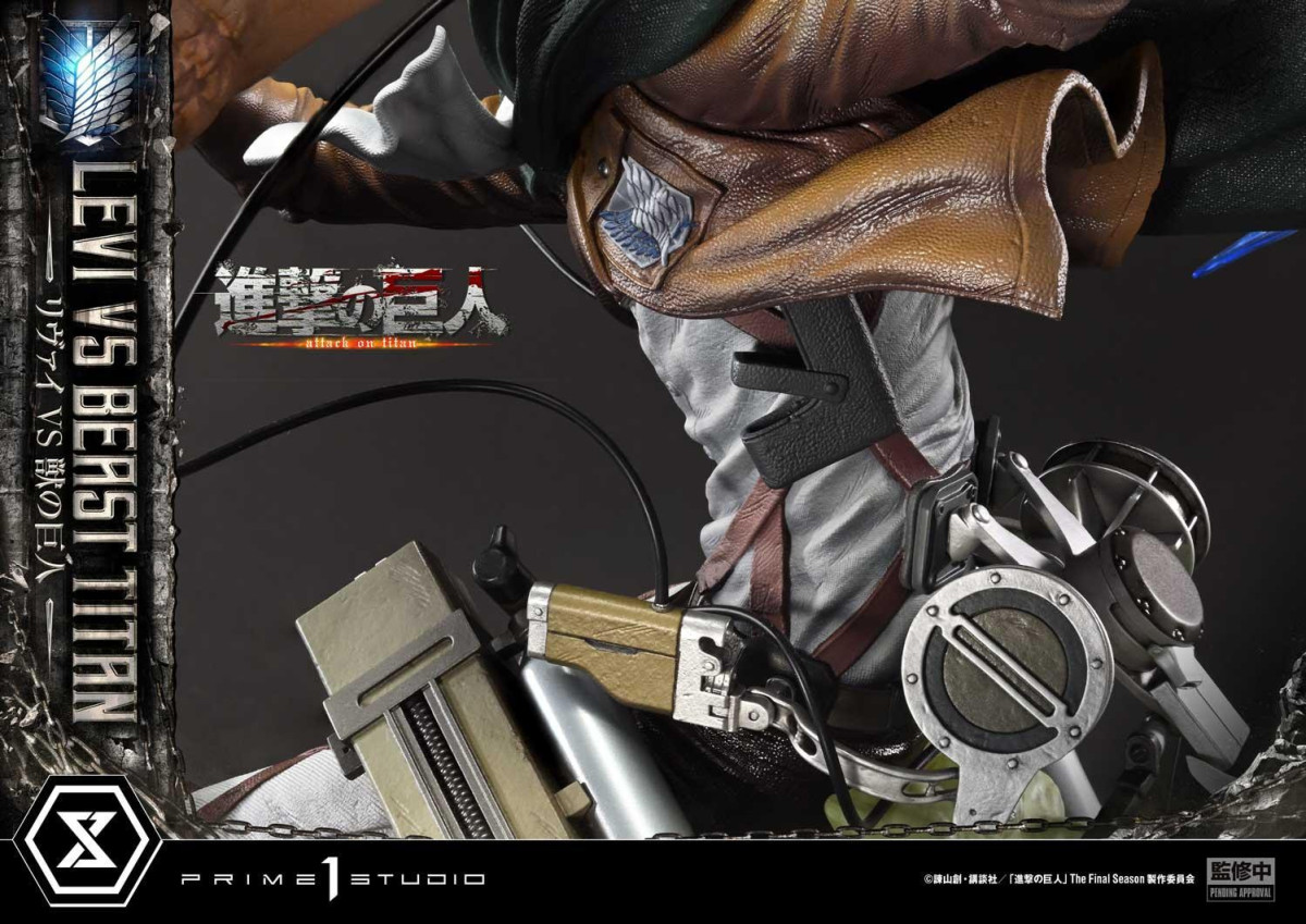 「Prime 1 Studio 進撃的巨人 里維VS獸之巨人」1/4 比例雕像,以高 73 公分、寬 67 公分的份量尺寸,將劇中最令人印象深刻的「兵長砍猴」經典場景立體化,還原在瑪利亞之牆奪還行動時,成功靠近野獸巨人並將之砍得四分五裂的熱血大場面!精緻服裝細節與複雜的立體機動裝置皆仔細打造,透過豐富的陰影塗裝和精確的細節來表達。里維斯捲起的斗篷和動感的姿勢營造出驚人的攻勢;搭配揮砍的斬擊效果件,生動表現出兵長穿梭在巨人絨毛又巨大的手掌之間,並將手指俐落砍斷,不讓野獸巨人以手保護自己的後頸的速度感。