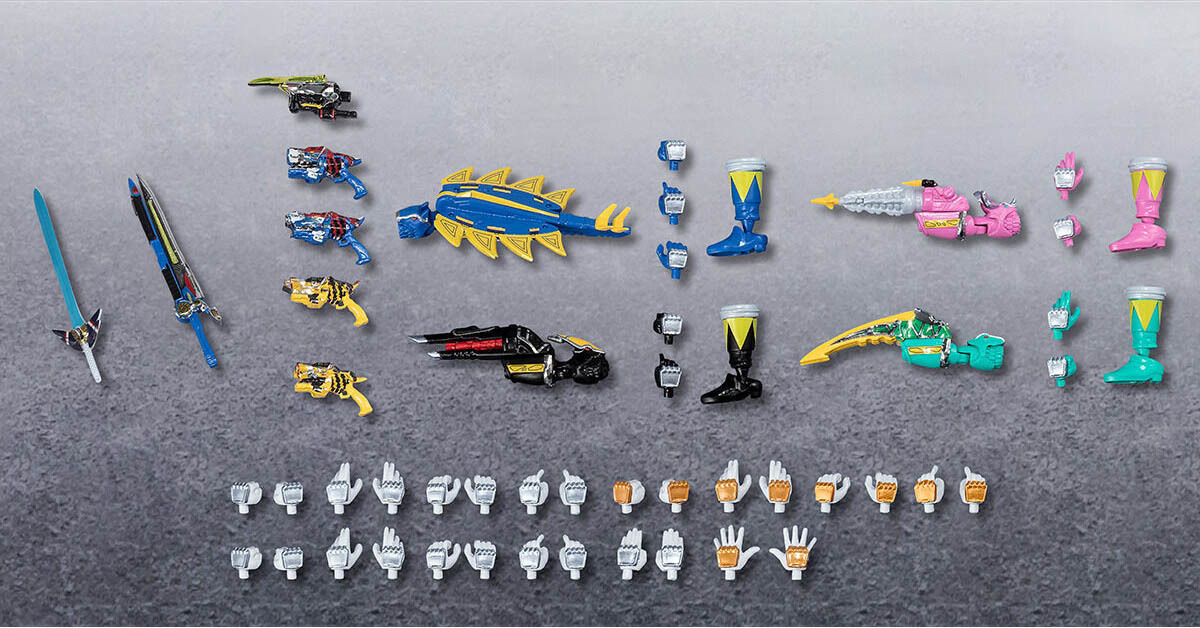 武器配件部分包含強龍金使用的龍咬變身器、斬擊雷電劍,強龍紫運用的龍咬左輪、龍咬斬刃,以及強龍銀使用的巨型龍咬左輪,可搭配多種造型手掌零件把玩出戰鬥場景。