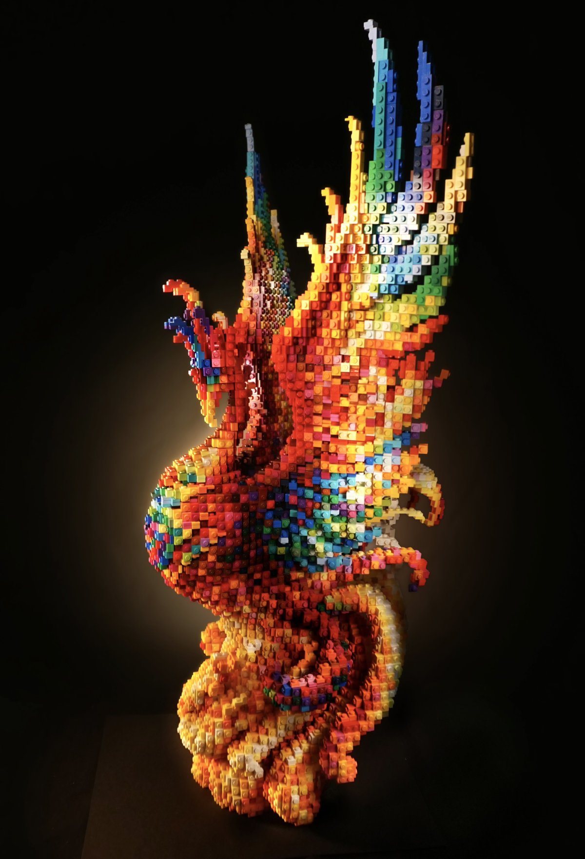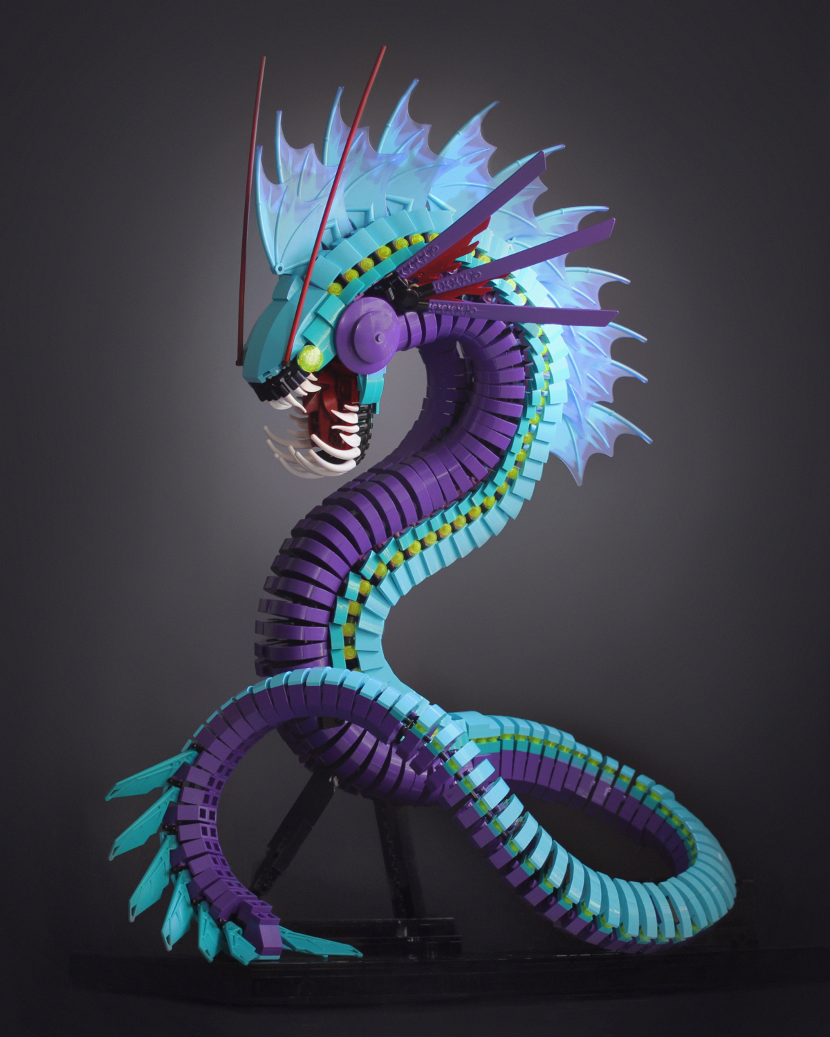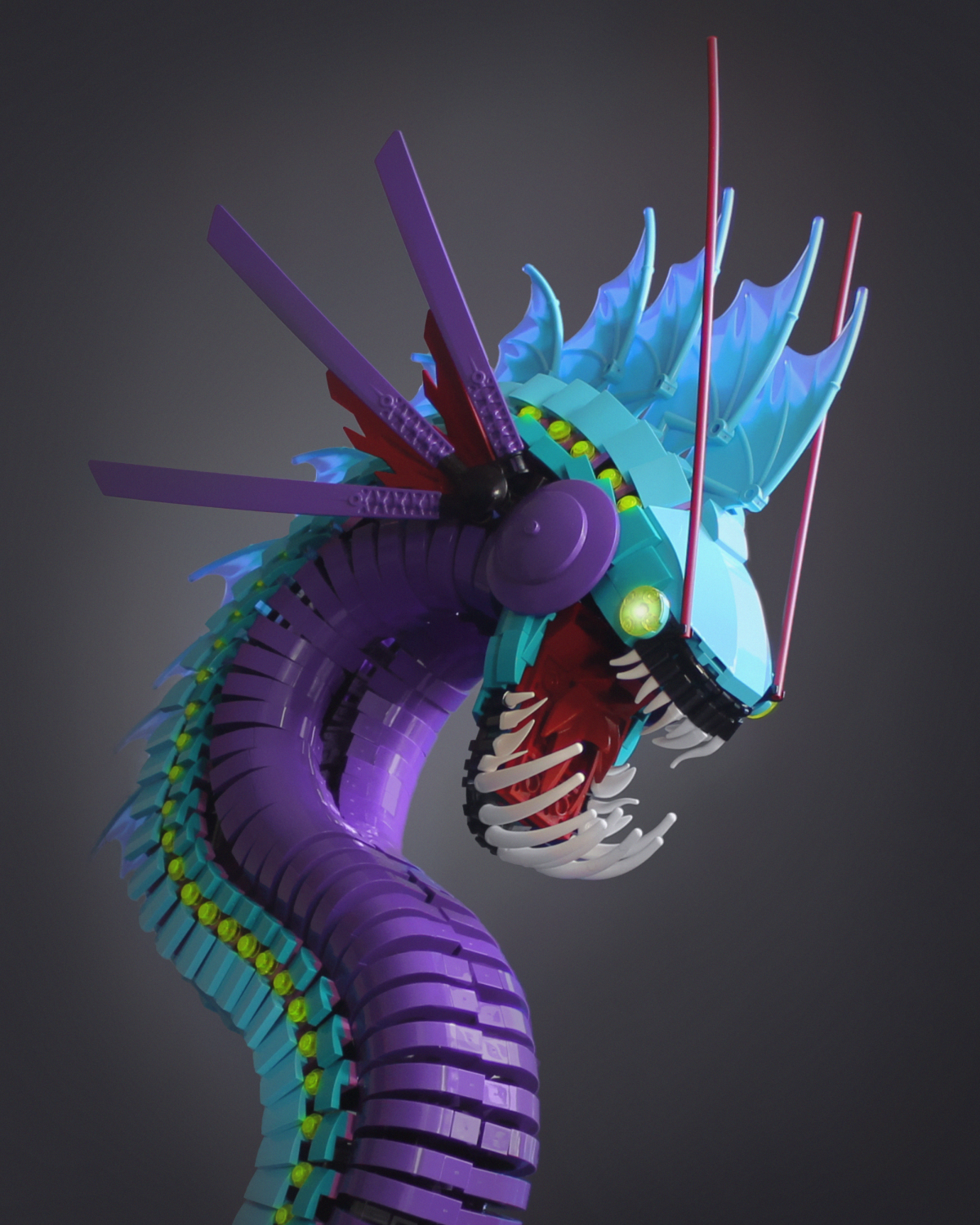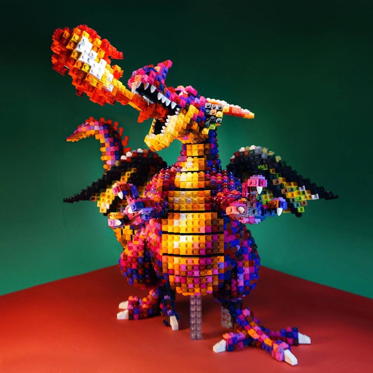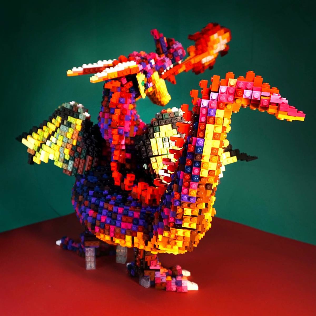 不同於許多設計者會盡量消除樂高積木的顆粒感,FukuTaku 可說是完全的反其道而行,將樂高顆粒作為他像素創作風格的招牌元素。而要在兼顧結構組成、重量平衡的前提下,同時顧及近乎全方位的顆粒感堆疊也是相當不容易,以下圖的大 BOSS 角色「龍王」為例,FukuTaku 就表示翅膀、尾巴都是經過多次的調整才完成。
