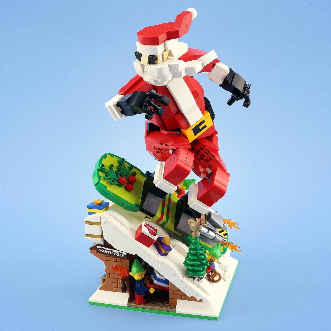 以下圖這個 2018 年創作、駕著飛行雪板的耶誕老公公作品為例,小編還記得當初第一眼看到就被 LEGO7 強大的動態勾勒能力給折服,不管是聖誕帽被強風吹拂的樣貌、雙臂的角度、彎曲雙腳的做法,還是留著大鬍子的臉部都相當傳神,而在底座中也不忘注入樂高小精靈人偶、禮物......等巧思。