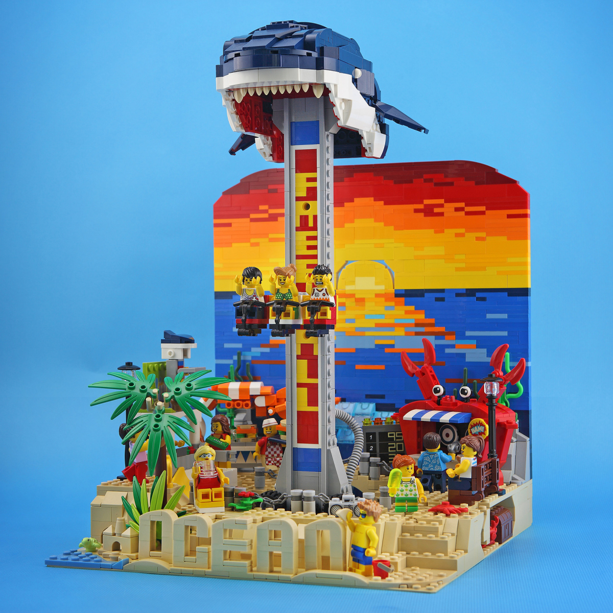 除了動物主題的樂高創作之外,狗神磚創對於場景製作、細節表達、配色呈現也很有一套,以這座海洋樂園(Ocean Amusement Park)為例,就能發現他在場景當中不只會塞入滿滿的細節,更會利用前後景配置、高低落差來豐富整體畫面的層次感,而在後方以馬賽克形式表現的海洋與夕陽背景板也是個很棒的元素。