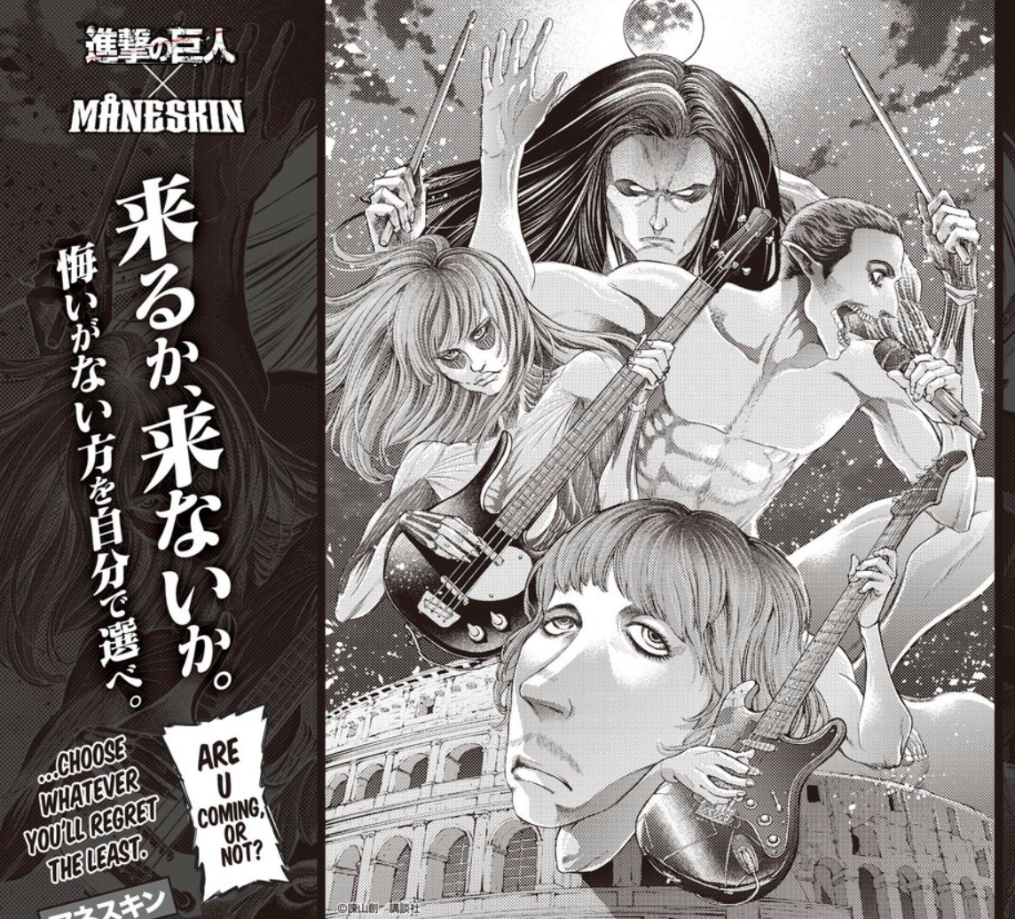 今日 ( 8/5 ) 天際月光樂團 Måneskin 也在 X 上公布,樂團與《進擊的巨人》作者諫山創的合作宣傳圖,讓人意外的雙方合作也在網路上引起網民熱議。