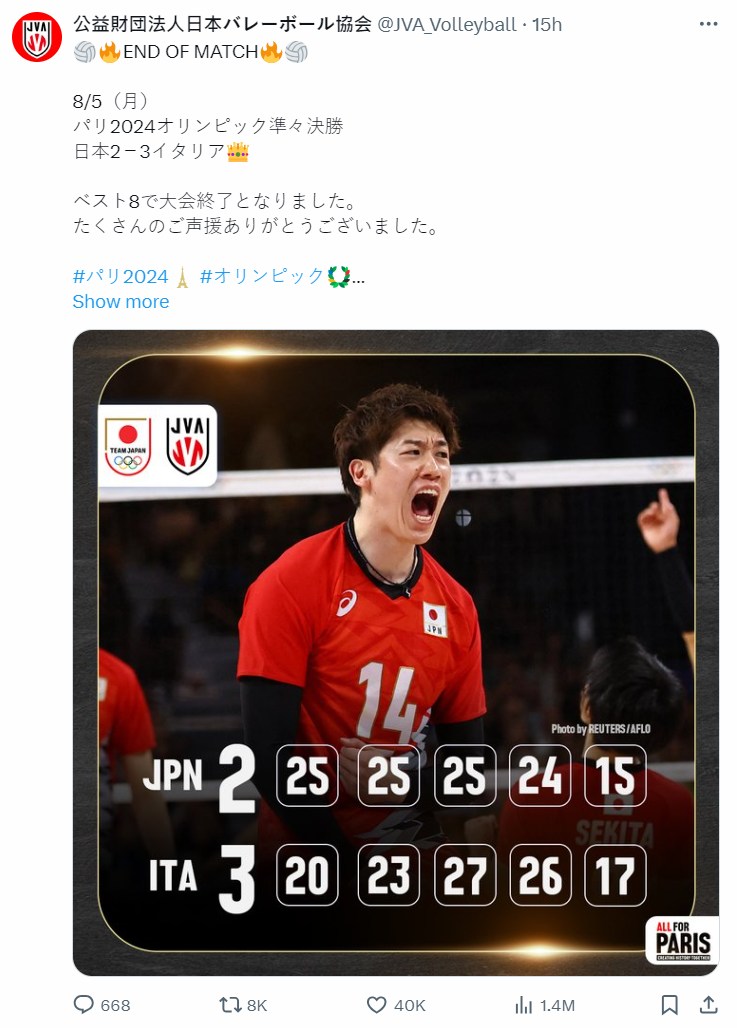 事實上這場比賽日本很有機會拿下,前兩局日本攻勢猛烈,連下兩城讓義大利陷入無路可退的窘境,不過義大利仍是世界強權,後續展開反攻一改頹勢,以 25:18、25:23、25:27、24:26、15:17,連翻三盤擊敗日本隊,這也是繼東京奧運後,連續 2 屆奧運日本再次遺憾止步 8 強賽。