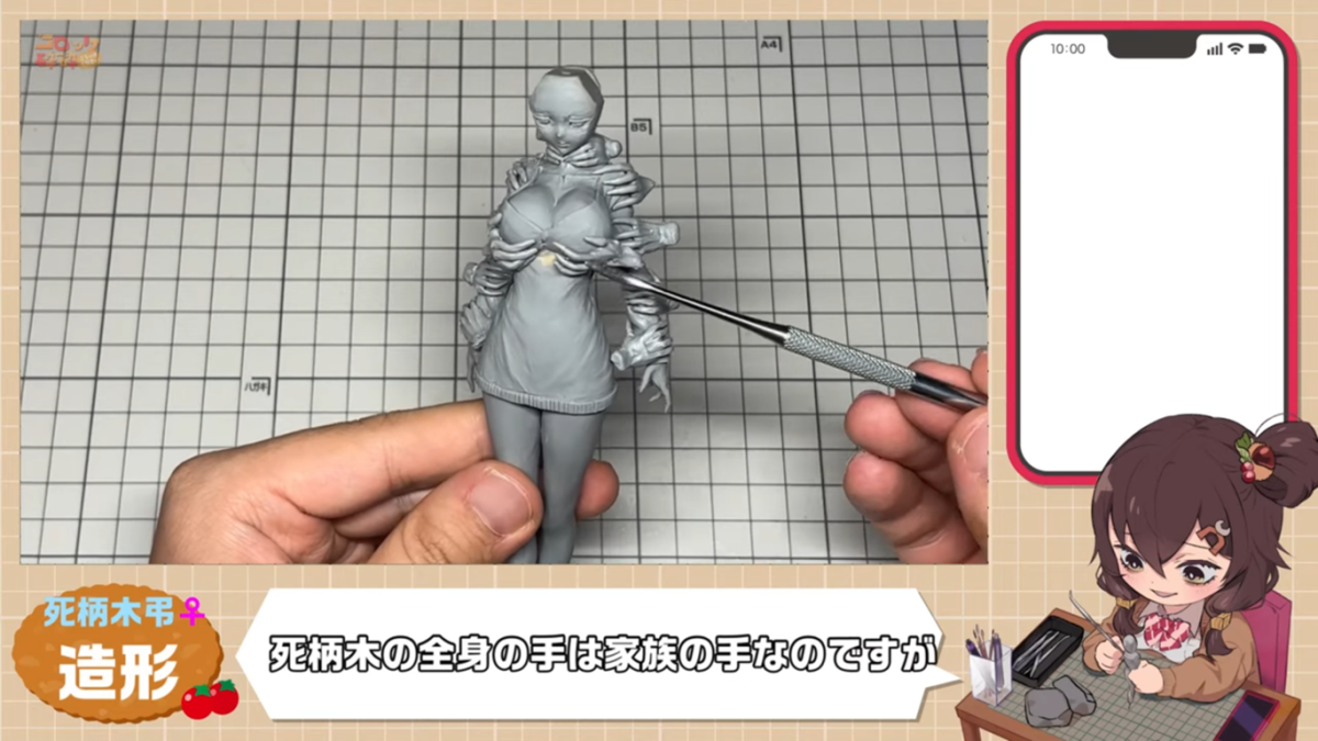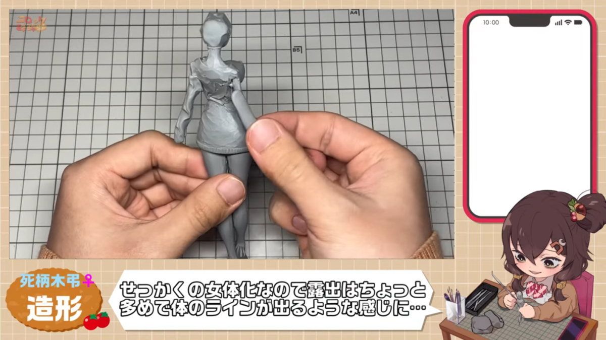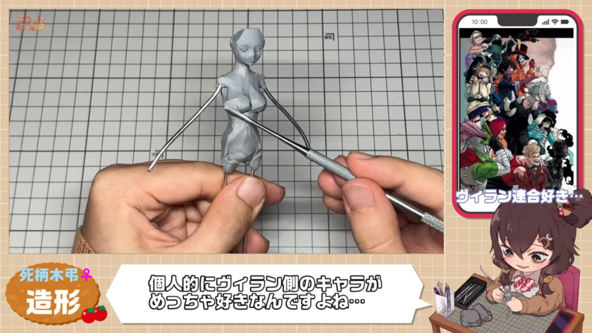 一樣透過黏土與鐵絲來捏出人形,從基礎的身體製作起步,コロッケ砕砕表示,《我的英雄學院》的角色設計都很有魅力,自己鍾愛敵聯盟的成員。這次想要把「女體化」的身材強調出來,於是就必定要捏個巨乳了 ( ? )
