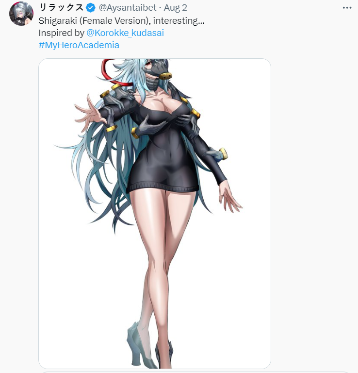 由於死柄木弔的服裝老是破破爛爛的,這次女體化試著以短到不行的 ONE PIECE 洋裝露出大面積的腿部跟胸部,展現出曼妙的身材。
