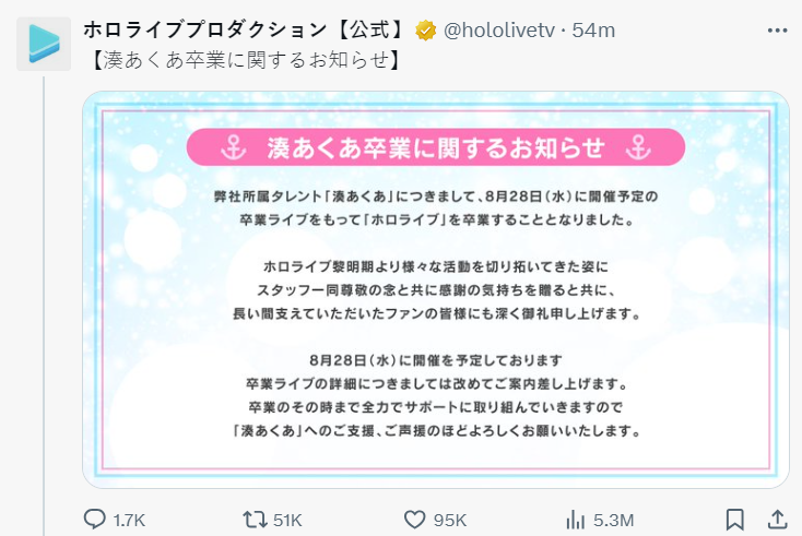 日本 Vtuber 經紀公司品牌 HoloLive 旗下的二期生「湊阿庫婭」,在今日 ( 8/6 ) 晚間直播上宣布,將在今年 8 月 28 日畢業,原因是與官方的方向性不一致(方向性の違い),決定忍痛宣布畢業,對於這些年來的活動非常開心,並向所有一路以來支持的粉絲表示感謝。