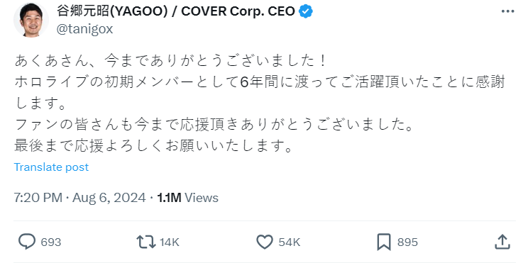 直播中也強調原因為與公司的方向理念不同(方向性の違い),請大家不要多做其他臆測跟攻擊,想跟所有人度過最後且最快樂的夏天。