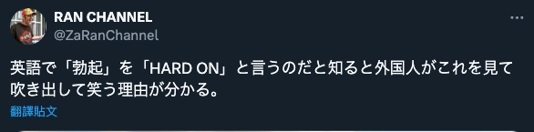 曾在美國海軍服役的網友「RAN CHANNEL(@ZaRanChannel)」,就和大家分享了這件事。他表示,「如果知道英文裡『HARD ON』是『○起』的意思的話,就會明白外國人看到這招牌到底在笑什麼了」。