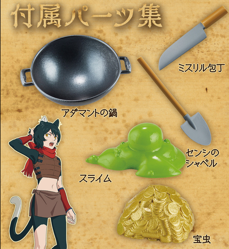 本次內容豐富的魔物全餐包含蛇尾雞巴西利斯克、巨魔像、走路菇、寶箱怪 4 款立體模型,高度約落在 3.6~6.8 公分之間,另外還有精金鍋、史萊姆、先西的鏟子、秘銀菜刀、寶箱、寶物蟲 6 種配件,以及重現澎湃魔物料理「大蠍子佐走路菇火鍋」的零件!從目前釋出的官圖我們終於可以看到巴西利斯克體內的臟器,以及必須利用哪些工具才能更為效率的處理這些魔物!比方說可以用秘銀菜刀切割走路菇的表皮、以鏟子挖掘暗藏著紅蘿蔔的巨魔像背部......等,但是我們對寶箱怪依舊是所知甚少,可惡,真的好期待這套玩具啊!