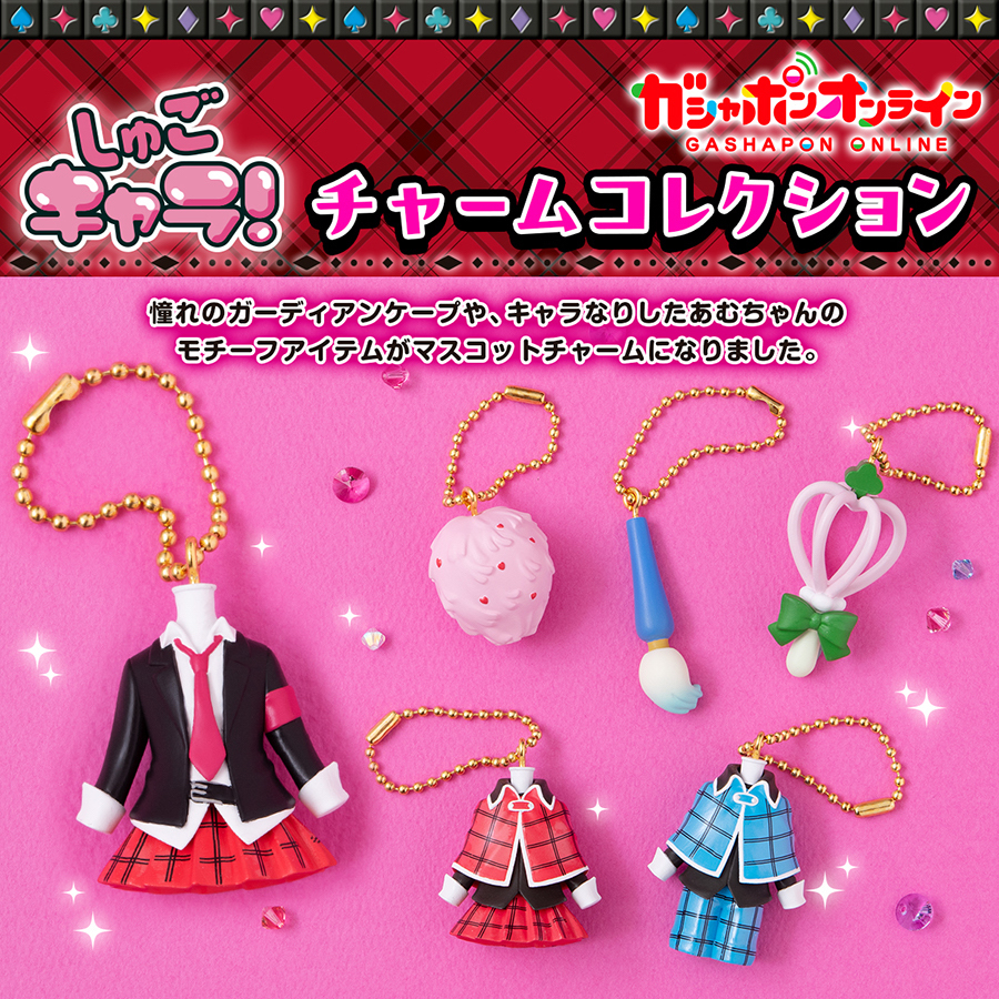 本次的「守護甜心!吊飾收藏」將作品中的多個代表物件製作為小吊飾,收錄亞夢與小蘭甜心出擊「Amulet Heart」(淨惡之心)型態時拿的粉色彩球、與米奇甜心出擊「Amulet Spade」(淨惡之筆)型態時拿的畫筆、與舒舒甜心出擊「Amulet Clover」(淨惡幸運草)型態時拿的攪拌棒、亞夢的制服、以及男女各一款的守護之星制服共六種款式,可以依各位玩具人的喜好將吊飾串連擺設,展示自己對於守護甜心的喜愛!