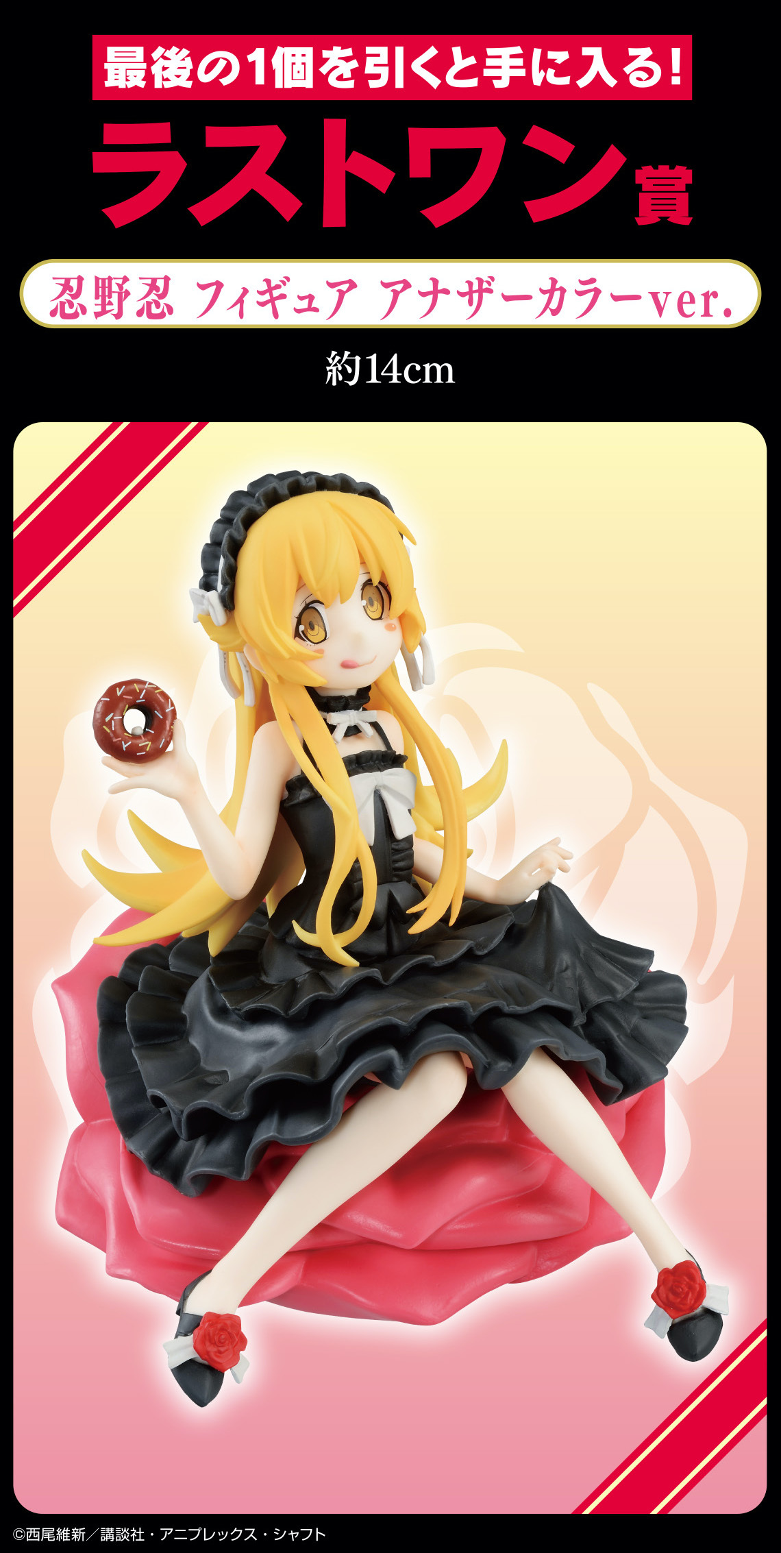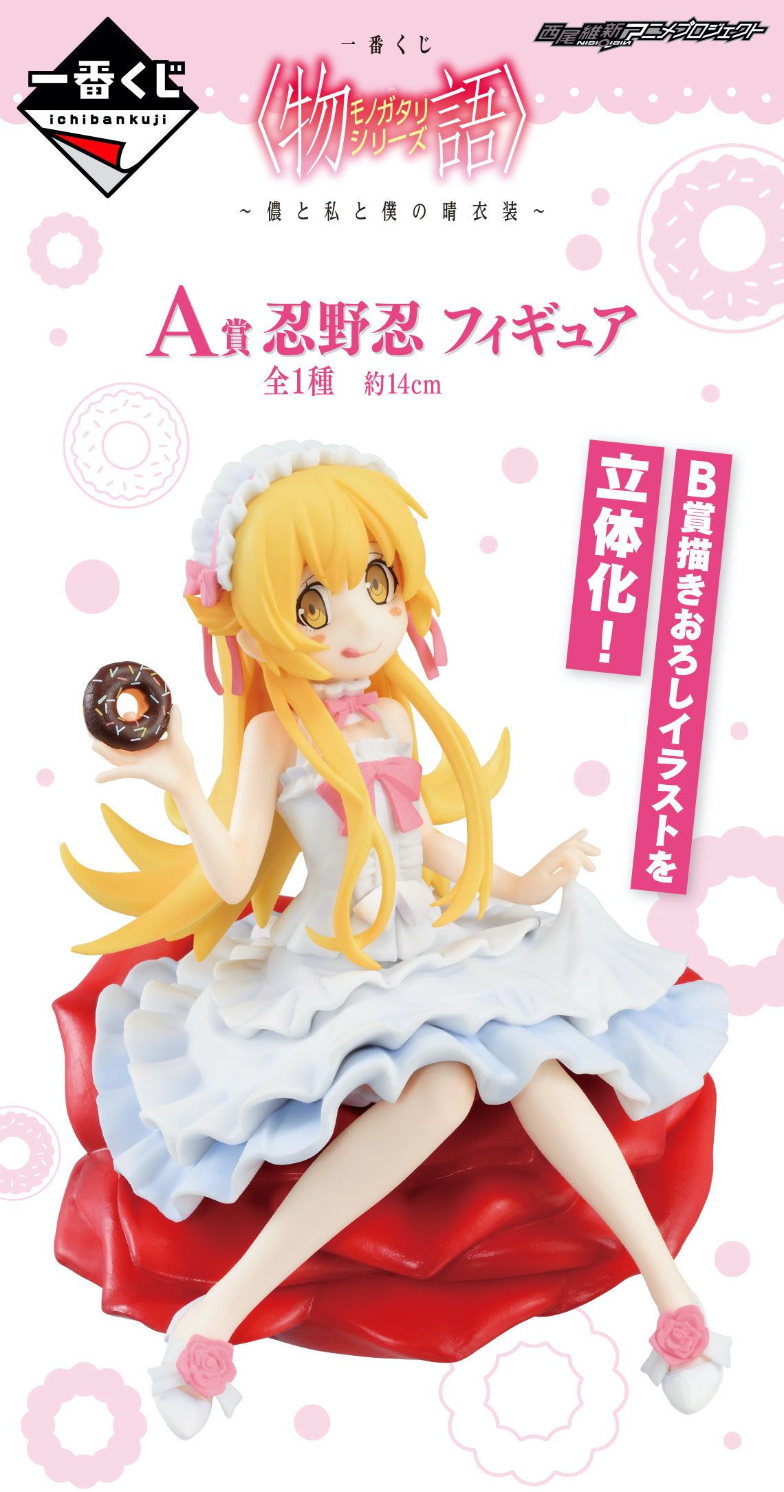 本次的「物語系列~我、我與我的晴衣裝~」提供 A~G、最後一賞與雙重中獎賞等不同級別的賞品。其中 A 賞為以一番賞繪製的原創插圖製作的忍野忍角色模型,製作出她身著白色洋裝坐在玫瑰花上吃甜甜圈的模樣,相當可愛!而最後一賞與雙重中獎賞則是以 A 賞改造為黑色洋裝造型的最後一賞色版本角色模型。