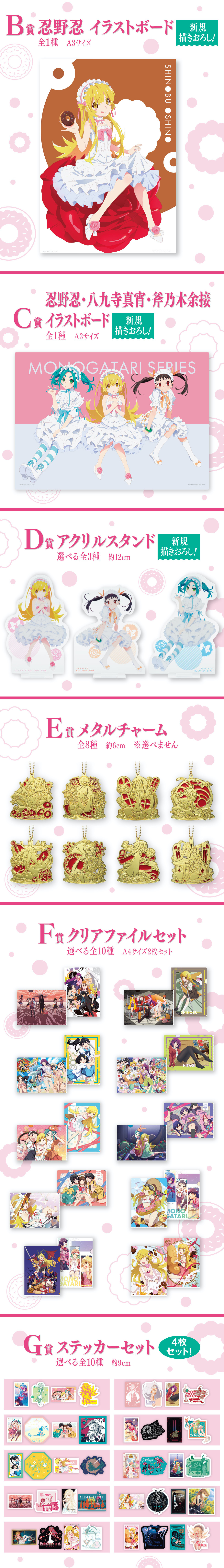 B 賞為一番賞繪製原創插圖的壓克力立牌,C~G 則分別是忍野忍・八九寺真宵・斧乃木余接的插畫板、壓克力立牌、金屬吊飾、透明資料夾套組以及貼紙套組,收錄了印有多位人氣角色插圖的賞品!