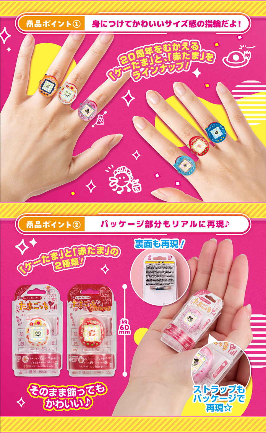 本次的「Ringcolle!塔馬可吉 3」以於 2004 年推出、即將在今年迎來 20 週年,配備紅外線功能的「ケーたま」系列為主軸,將 12 款塔麻可吉製作為戒指的造型,雖然不具備實際的遊玩功能,但從機體本身到兩款包裝都還原了當年的模樣,連包裝盒中的吊帶和背面的商品標示都一併還原,就算不拆開作為戒指,直接展示也超級可愛!