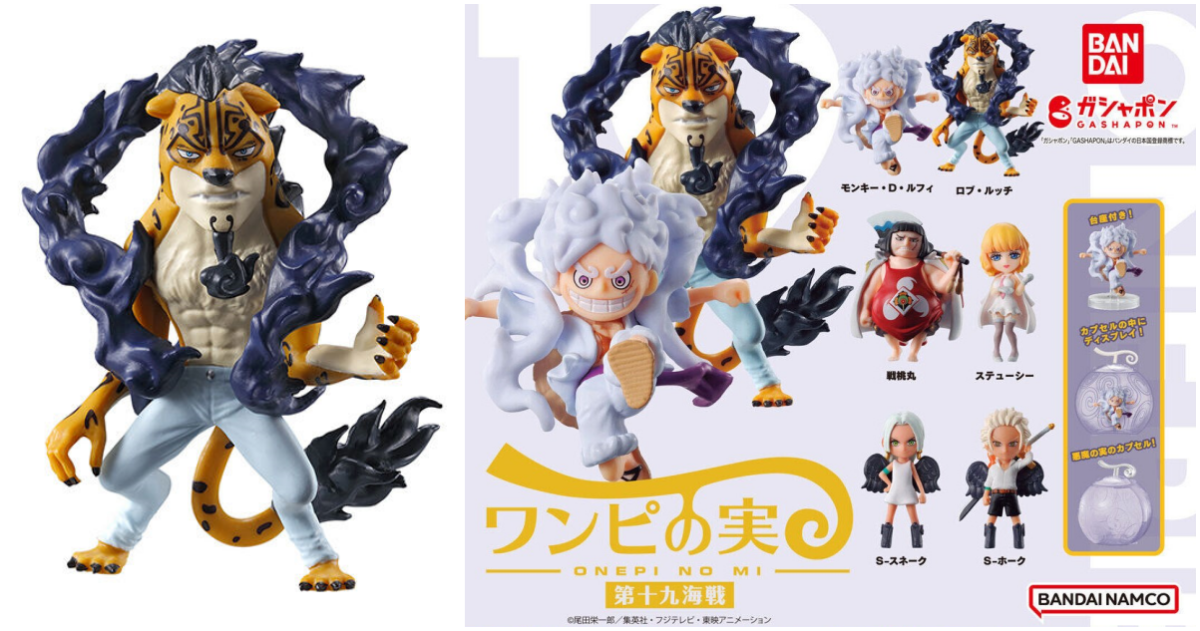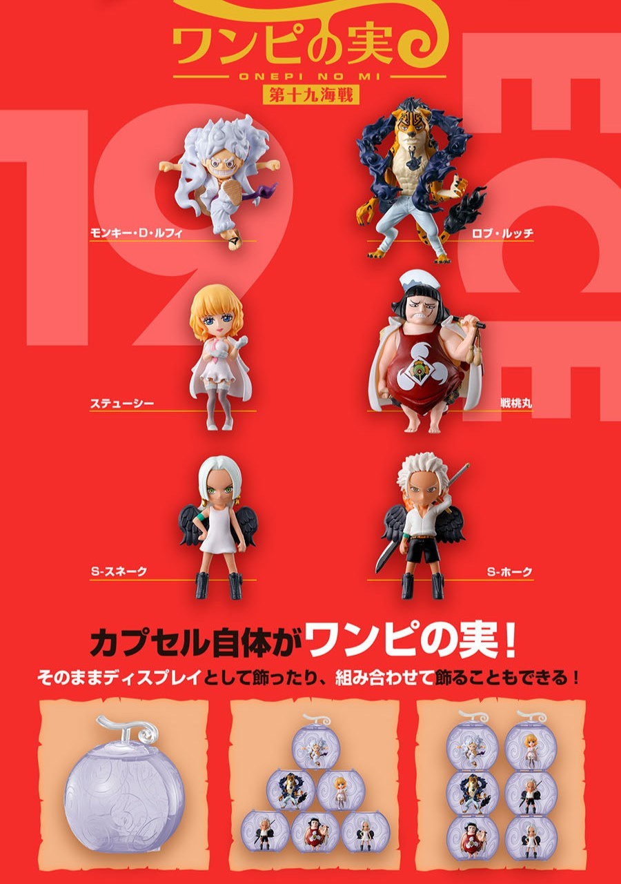 將轉蛋殼化身惡魔果實、連尾田榮一郎老師都激推的「From TV animation ONE PIECE 惡魔果實 第十九海戰」轉蛋,在高約 90 mm 的轉蛋殼中還原了惡魔果實的造型,並且設計為可以拆開組裝、疊放為展示架的多功能透明環保轉蛋殼,整組收藏超壯觀!本彈收錄有五檔魯夫、絲媞希、S-蛇女、羅布·路基、戰桃丸、熾天使六款角色,人物角色採用 Q 版詮釋,還原細部的造型與色彩塗裝,兼具可愛與細節!