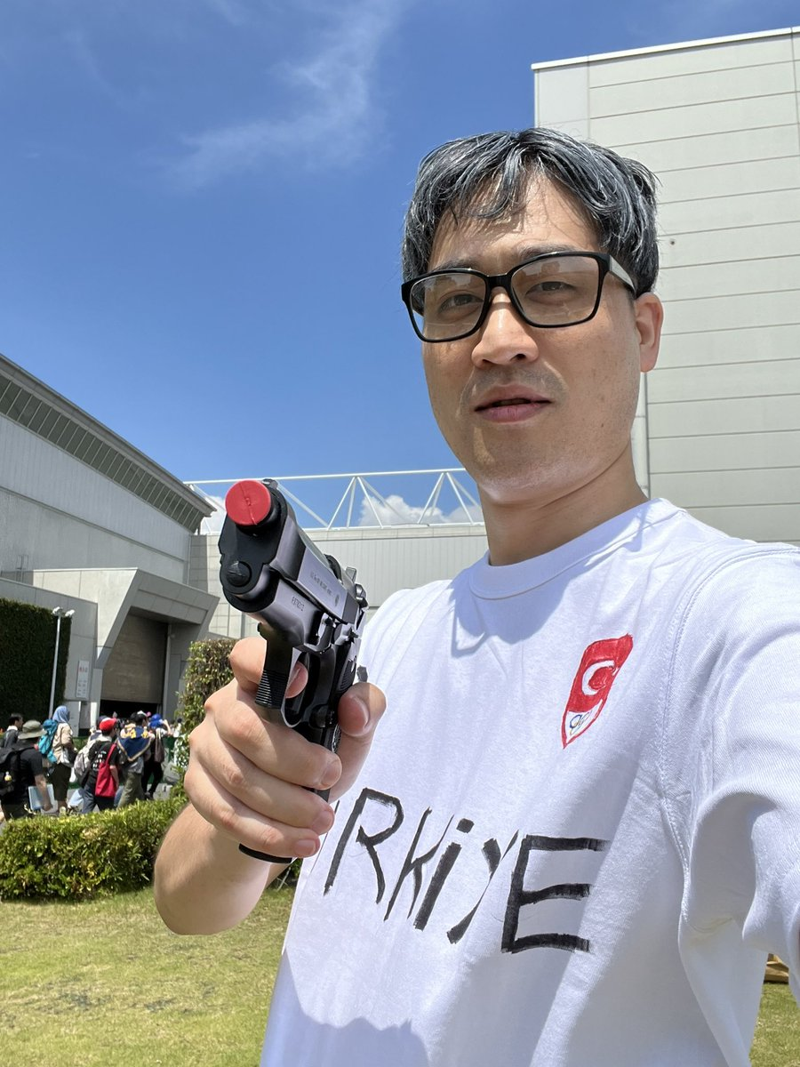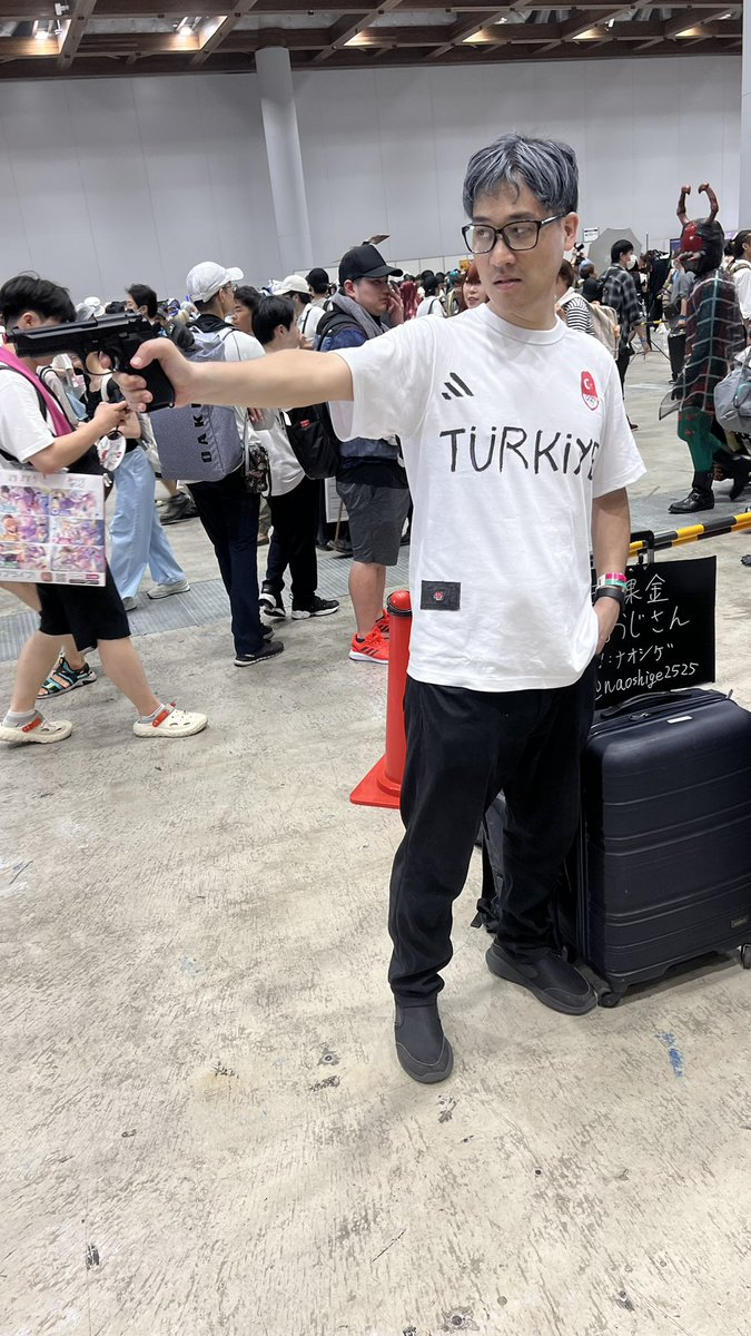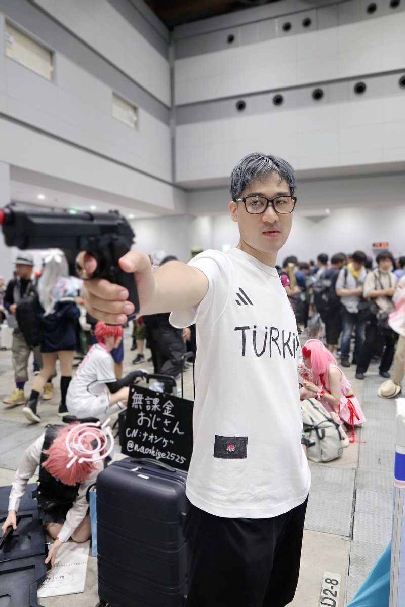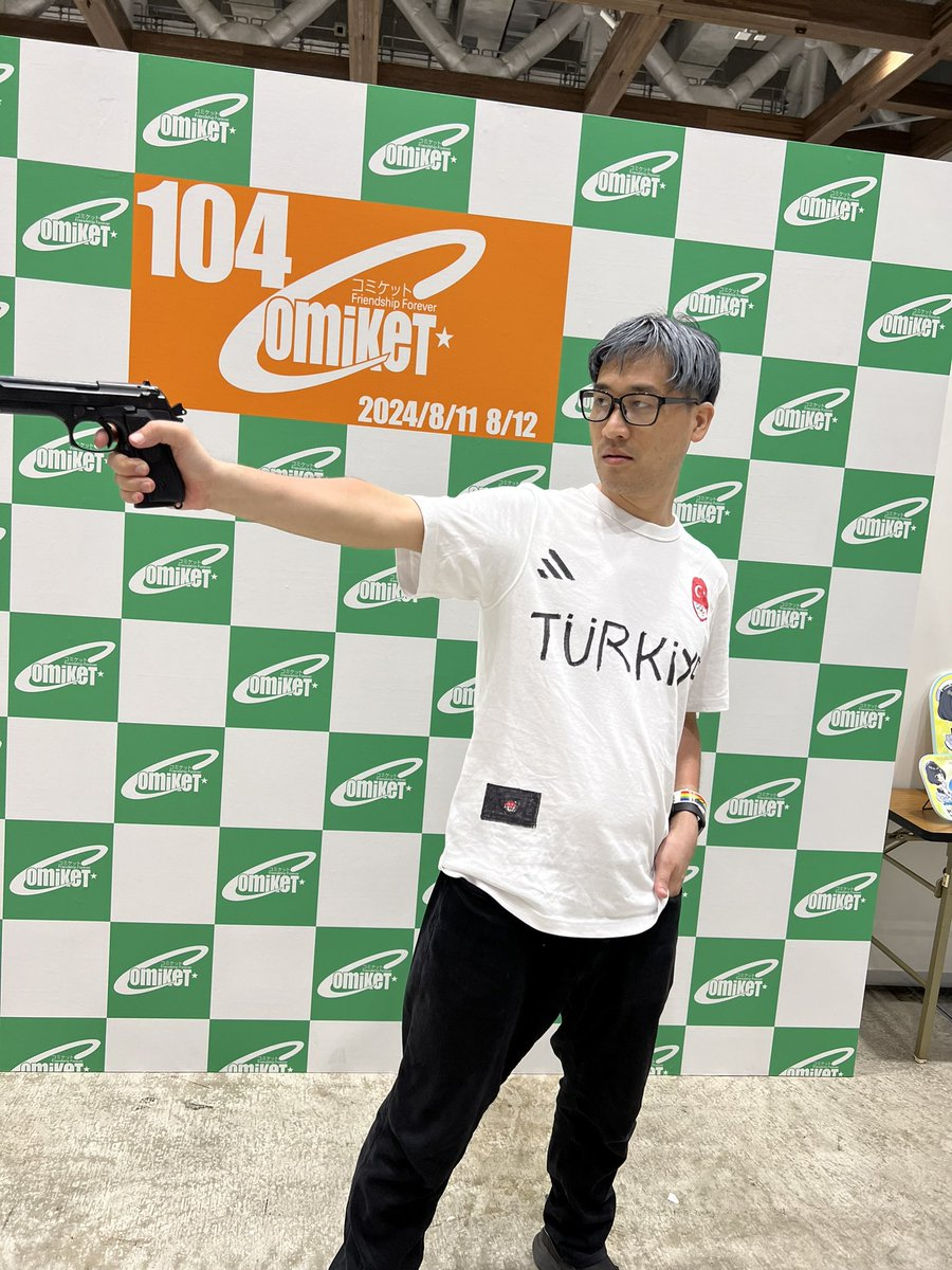 頭髮自己染成銀白色,因為買不到土耳其射擊國家戰袍,只好自己手繪成類似的樣子,自己也非常關注奧運,對這位引起話題的 Yusuf Dikeç 感到無比尊敬,自己也想嘗試看看就決定這樣參加 C104 了。