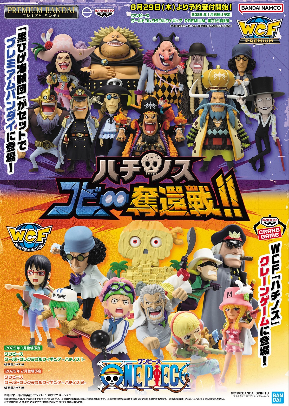 另外就是海軍 VS 海賊這邊~WCF 以蜂巢(ハチノス)為題推出兩彈,目前尚未得知確切角色位於的彈數,但從官圖來看應該會包含海軍的傳奇英雄「卡普」、「克比」、「貝魯梅伯」、海軍少將「普林司·古勒斯」、海軍中將阿鶴的孫女「孔雀」、「雲雀」、「達絲琪」、「青雉」與「雨之矢龍」,看來還會有一個施展島島果實能力的亞帕羅·比薩羅。