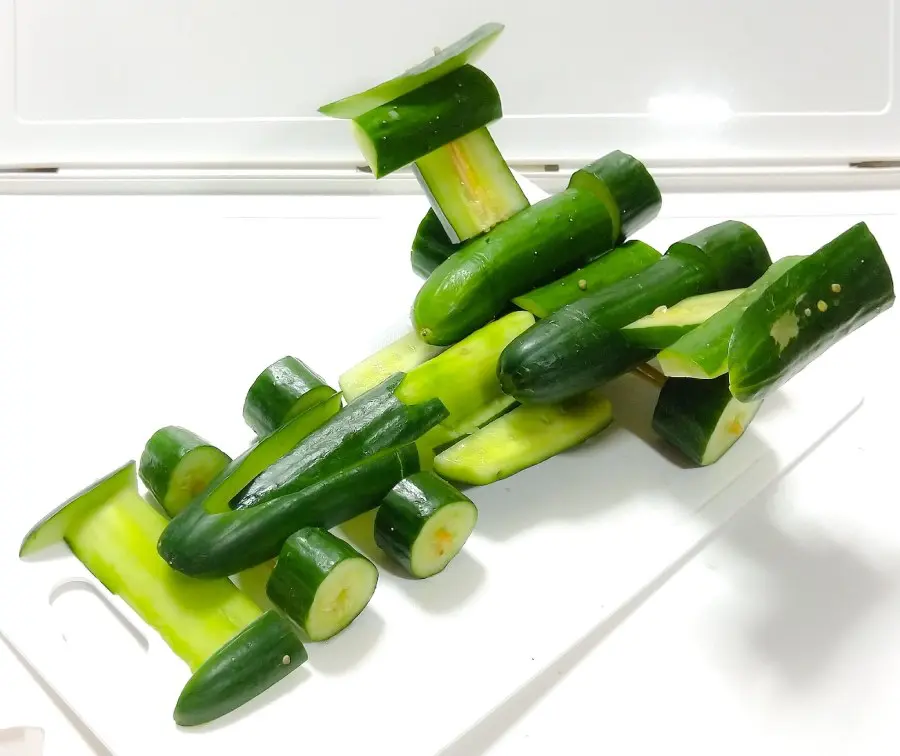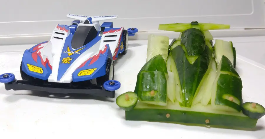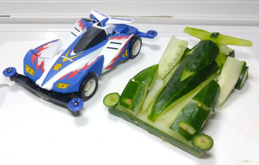 他選擇的是《爆走兄弟》中主角星馬豪的二代車種「勝利衝鋒」來當作製作範本,總共用了 3 根黃瓜來做這件事。一根黃瓜用於底盤,一根用於車身,一根用於輪胎,黃瓜經過精心挑選,尺寸恰好適合機器的每個部件。牙籤和竹籤用於固定滾輪和尾翼。