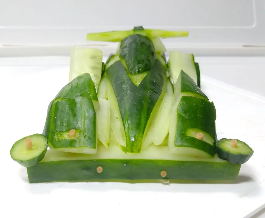 在製作過程中,推主表示自己特別專注在,如何保留黃瓜原始形狀的同時,還製作出該有的樣子。「勝利衝鋒」車體有很多尖銳的部分,但他盡可能地保留黃瓜的樣貌,尤其在頂篷和輪胎部分。