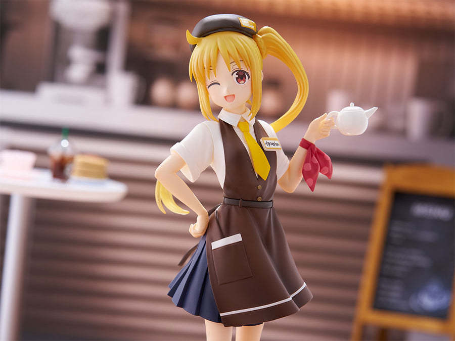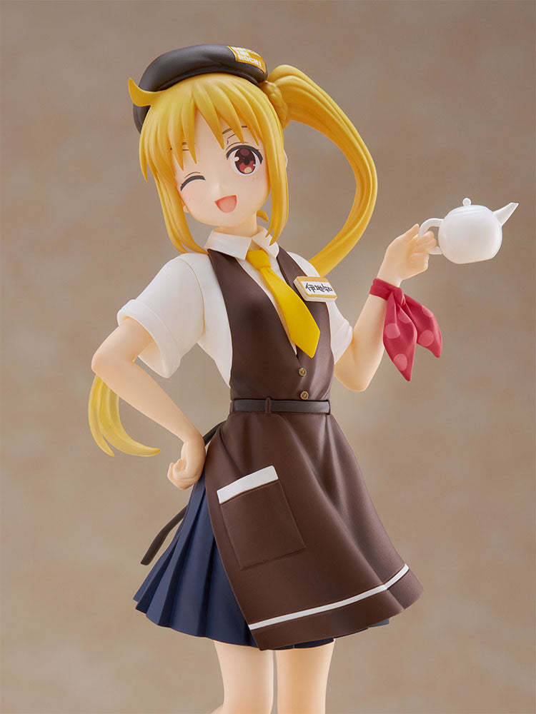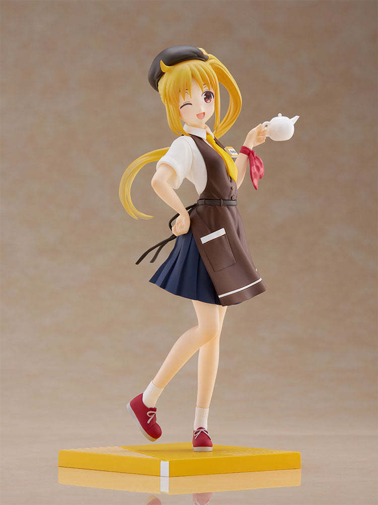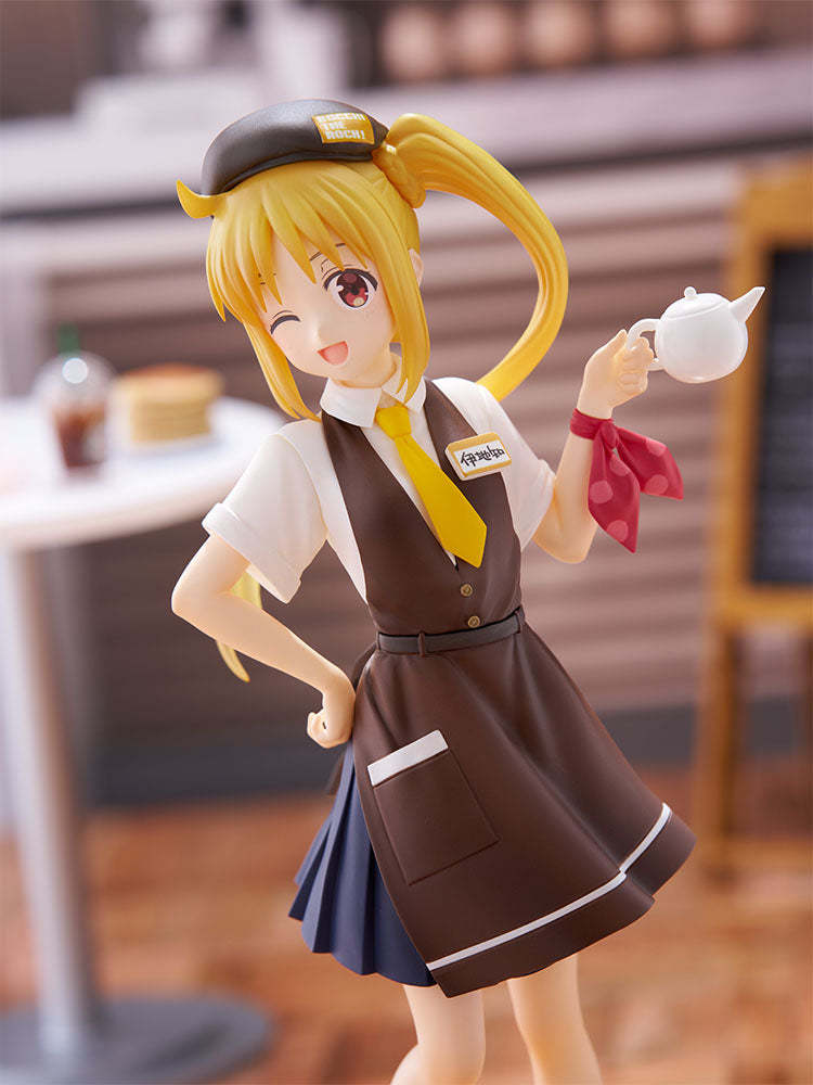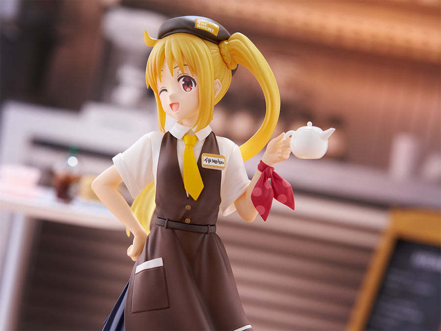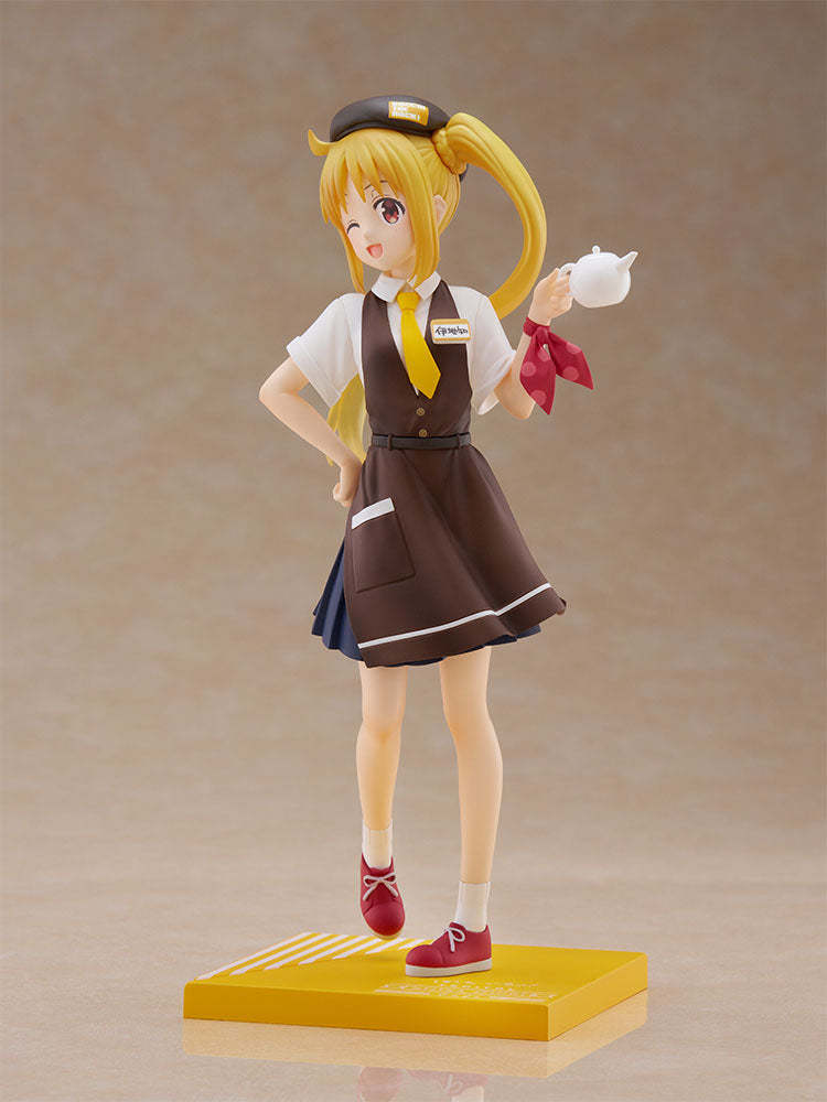 本次的「伊地知虹夏 咖啡廳風格ver.」全高約 20 公分,延續本系列特色為虹夏打造原創的咖啡廳店員造型,一手拿著茶壺、另一手插著腰拋媚眼的神情相當的輕盈可愛,與看起來充滿不安的小孤獨形成鮮明的對比!服裝部分為虹夏準備了咖啡色的圍裙、貝蕾帽以及黃色領帶,平時配戴的蝴蝶結則是作為配件綁在了手腕上,胸口名牌上細心地寫上了虹夏的姓氏「伊地知」,頭髮同樣以透明材質打造出剔透的視覺效果,整體展現出了虹夏活潑的個性!店員小姐我已經準備好要點餐了!
