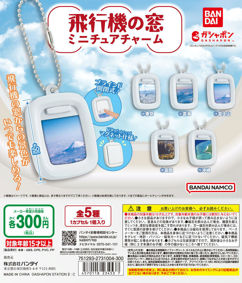 在搭乘飛機的時候總是會情不自禁的望向窗外的景色,尤其是起飛和準備落地時鳥瞰目的地風景的角度更是讓人難以抗拒!本次的「車窗系列 飛機窗戶吊飾」便是將從飛機窗看出去的景色製作成了約 5 公分的吊飾,把飛機窗戶縮小並貼上各個不同地方的景色,收錄「東京」、「雲海」、「富士山」、「函館」以及「沖繩」五種款式,將從空中拍攝的景色收納在窗框之中,更還原了飛機窗戶擋板的開關設計,可以重現打開擋板看見美景的瞬間,讓各位玩具人能夠在 300 日圓的價格享受搭飛機去日本旅行的體驗!