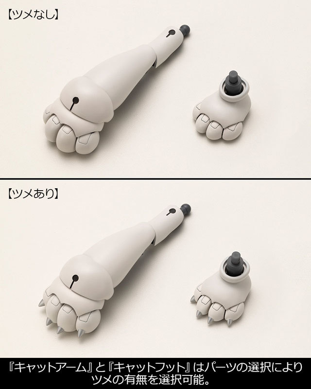 套件中的貓手臂、貓腳掌都能藉由替換零件方式再現有無爪子兩種造型,貓咪尾巴則由四軸可動零件構成,能把玩出生動的擺動曲線。貓耳髮圈附有髮圈部分使用合成橡膠材質的「通用型」以及搭配『機甲少女 禍月』系列使用的「禍月系列專用型」。