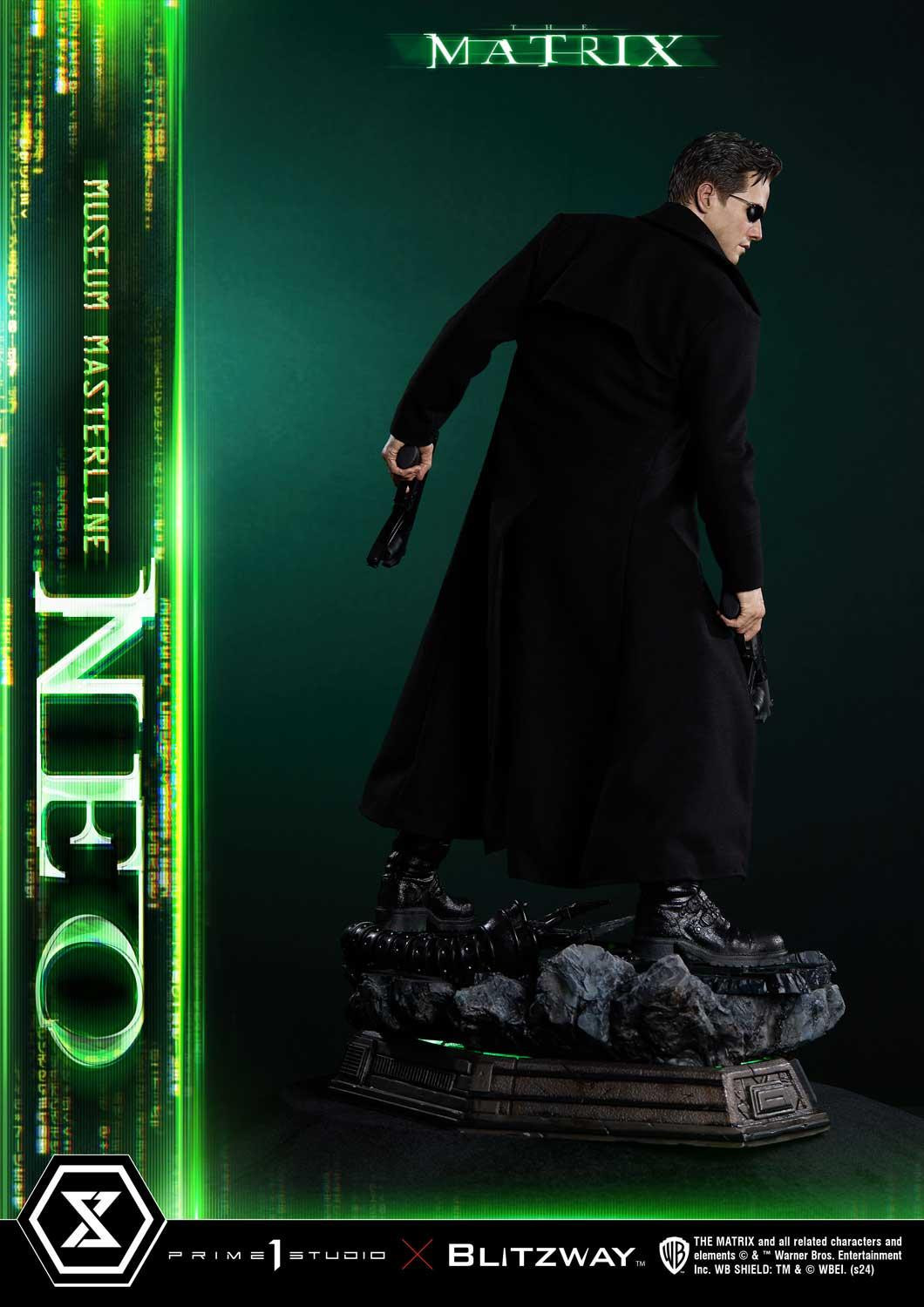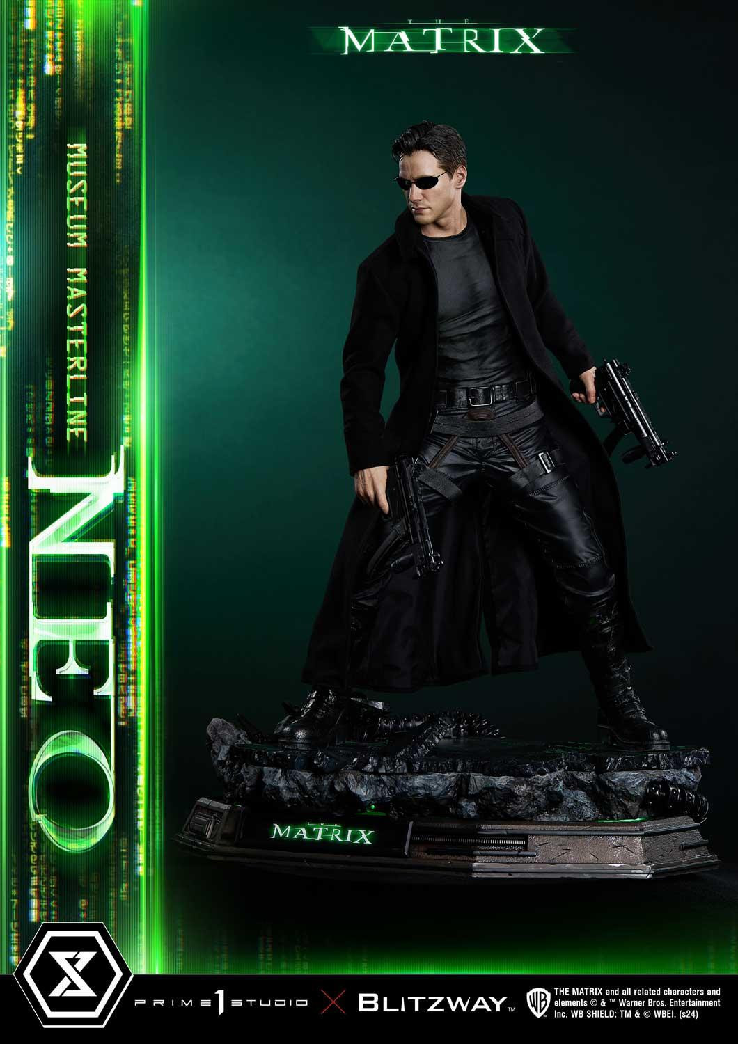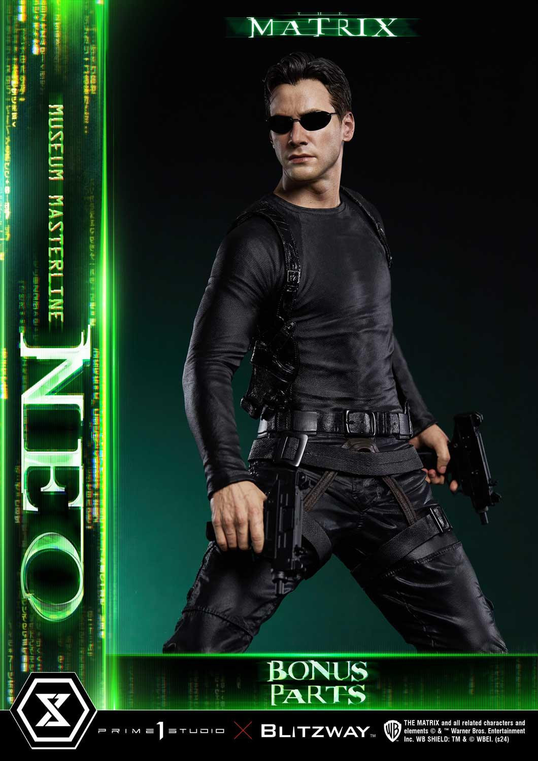 「Museum Masterline 尼歐 Bonus版」1/3 比例收藏雕像,以尼歐在劇中作為救世主甦醒,將莫菲斯從困境中拯救出來的「子彈時間」場面,令人感受到印象深刻的視覺特效動作!尺寸全高 71 公分,徹底還原演員基努•李維那張無所畏懼、神秘莫測的面孔,臉部輪廓和逼真皮膚紋理等,都透過精密加工的樹脂精心打造而成;標誌性的墨鏡也細緻再現。