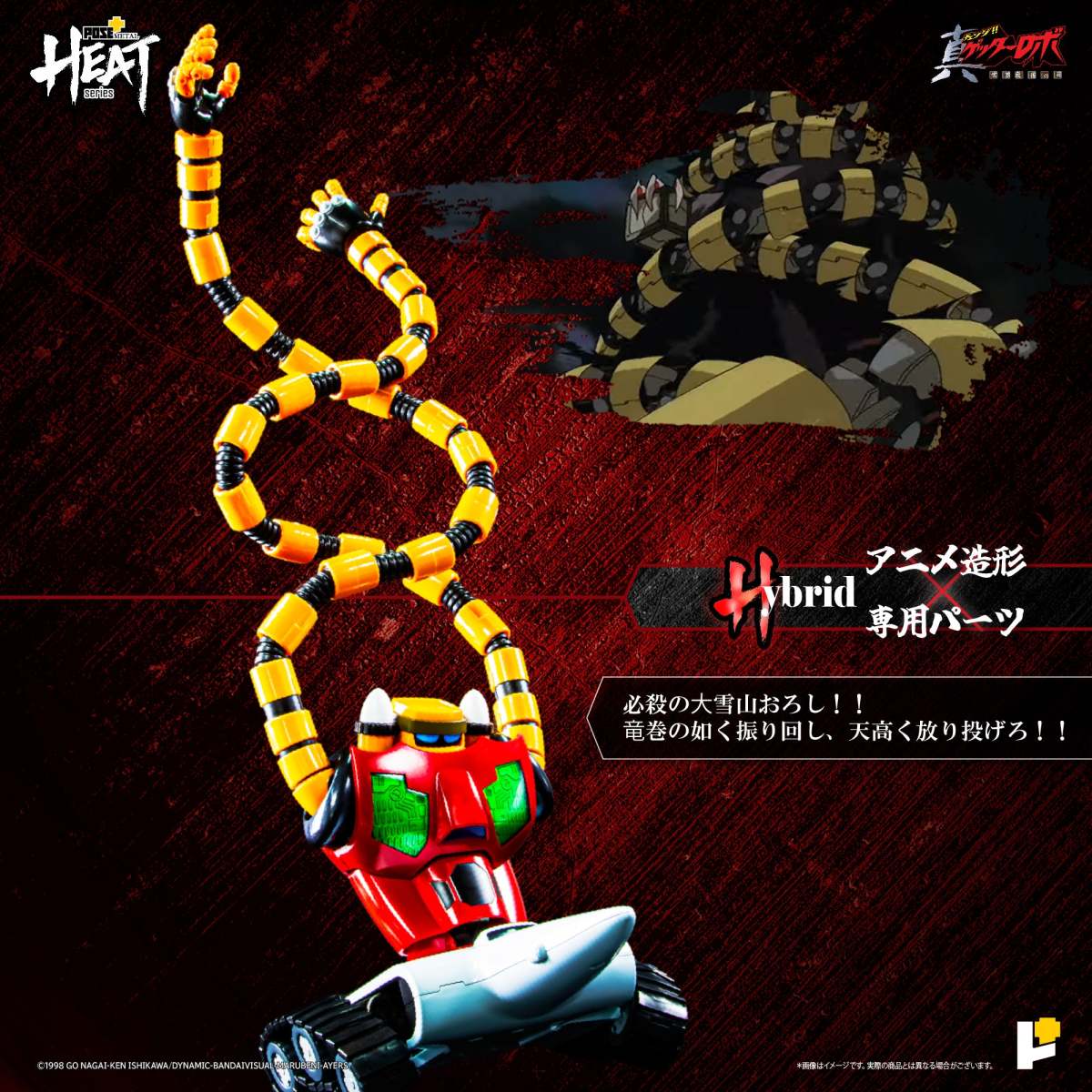 「METAL HEAT」系列模型主打合理的價格與在合金模型的精美造型下維持高度的可動,名稱的「HEAT」以三個此系列賣點的四個字母首組合而成,分別是結合動畫造型與豐富配件的「Hybrid」(H)、高度可動的「Extended Action」(EA)以及集結作品中夥伴的「Team-up」(T),為玩家們打造結合造型、可動性以及角色收藏的高品質合金模型作品!