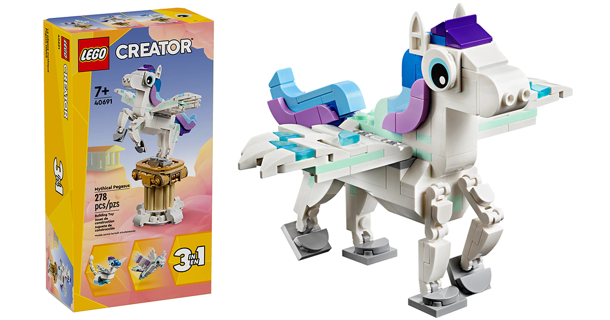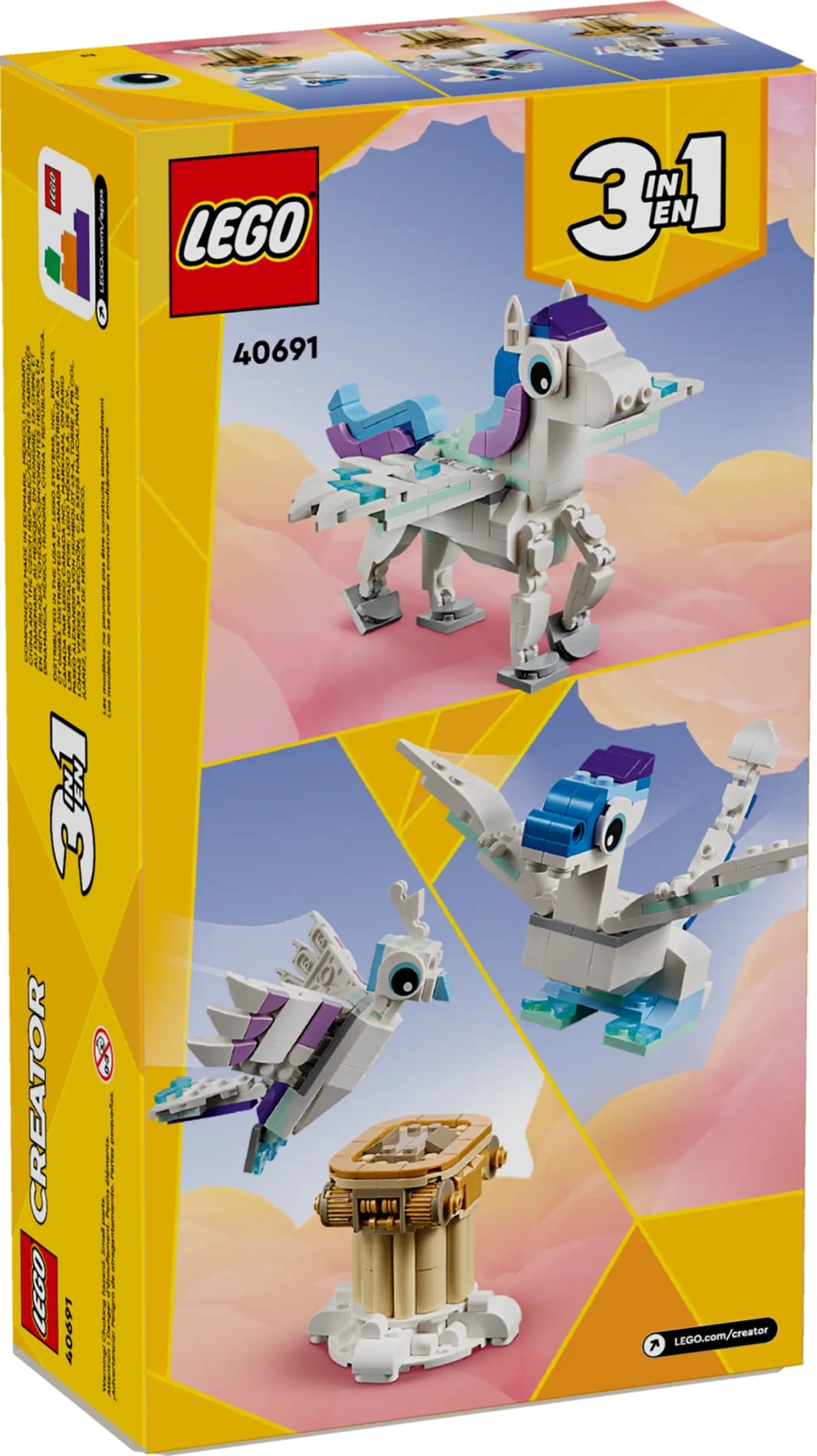 本次屬於創意系列百變 3 合 1 的「40691 神話中的飛馬」擁有 278 片零件,是由 George Gilliatt 操刀設計,造型上會讓人想到 2023 年的「31140 魔幻獨角獸」,而 George 也表示這次的飛馬的確就是魔幻獨角獸失散已久的姐妹~