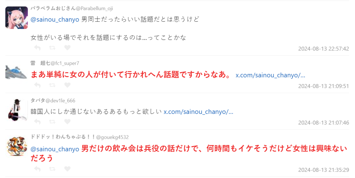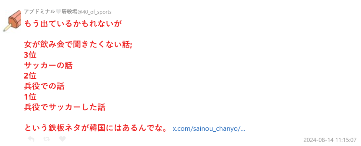 但提到「聊當兵」,這似乎是男孩子常見的聊天話題,畢竟人生難得的體驗,當男人聚在一起就難免提起。日本有位居住在韓國的推主,就在 X 上表示,似乎「不受歡迎的韓國男性,總愛在酒會聊當兵」,這樣的發言也引起網民熱議,對此表達看法。