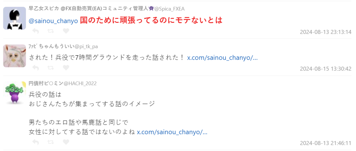 不過亦有網友指出,當兵雖說是對國家的付出,這種話題不受歡迎可能也是在所難免。畢竟日本人沒有義務役,比較難想像這樣的話題。但網友也指出,通常會聊當兵的通常是年長的男性,一群人聚在一起難免就會這樣。