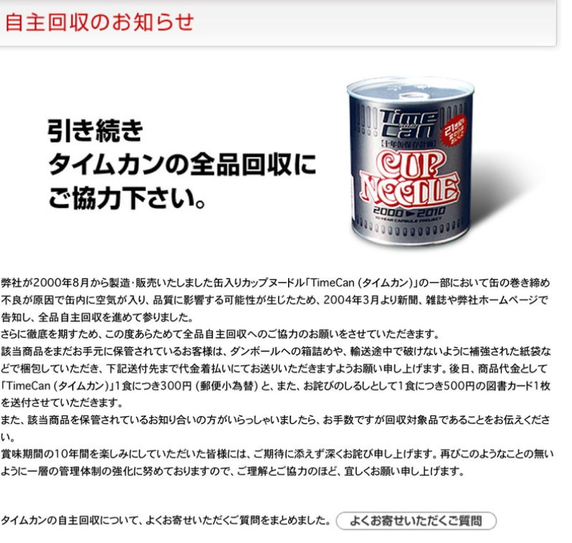 事實上,這款 2000 年發行的「日清杯麵時空膠囊」,主打採用特殊的氣密方式封存,讓裡面的杯麵可以保存長達 10 年之久,當時推出蔚為話題。不過後來因發現所使用的密封技術藏有漏洞,空氣會跑到罐內喪失保存效果,後來也被日清官方聲明全面回收,現在變成一個稀有的絕版商品。