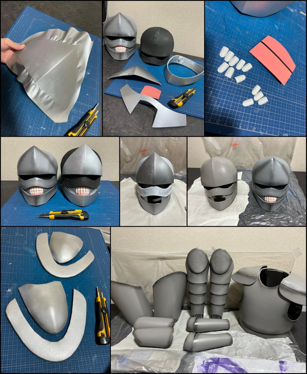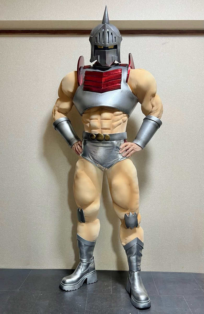 擅長製作 Cosplay 服裝道具的アムロ,這套盔甲人服裝全部出自他個人之手,透過巧妙的手藝跟製作能耐,將原作的盔甲人裝扮完美還原,他也此裝備自豪,常常穿上這套並帶著吉伊卡哇小可愛的娃娃出席活動。
