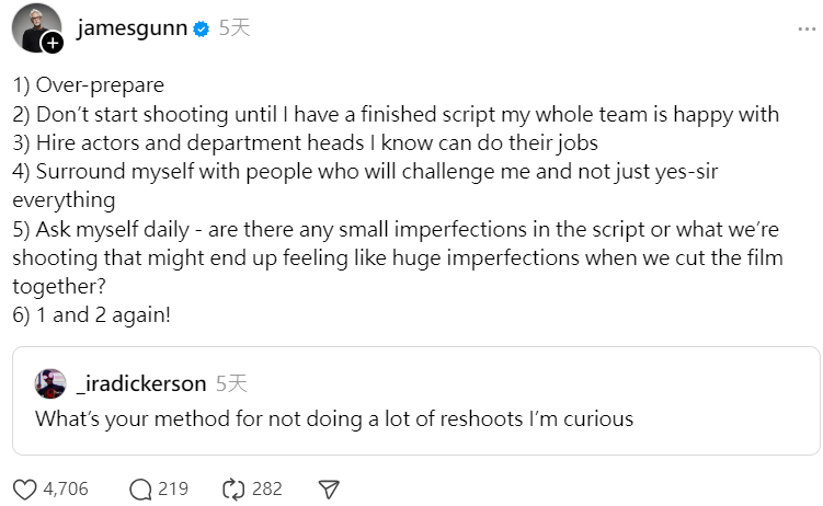 時逢新版《超人》(Superman)電影殺青,DC 影業共同執行長 詹姆士·岡恩(James Gunn)在 Threads 上透露,不同於過去多數大片的拍攝方式,《超人》將不會需要進行補拍,未來的 DC 宇宙也將堅持這項原則。