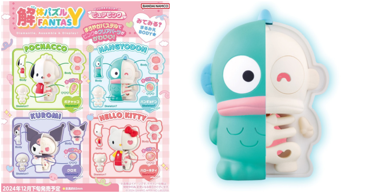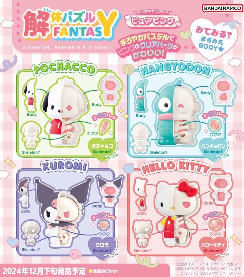 「KAITAI FANTASY」以「解體」為主題,運用嶄新的想像將角色們的解剖構造透過立體拼圖呈現。由底座、骨骼、趣味造型的神秘器官以及一半的表皮組成,半剖的設計讓玩具人們可以窺探到這些可愛角色們的最深處~