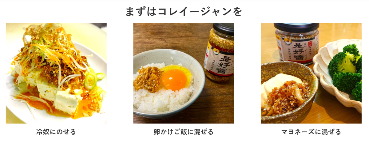 主打只要加入就可以在料理添增中華料理的美味口感,亦可用於日本常見的冷豆腐、蛋黃拌飯或搭配美乃滋混成獨特的醬料。