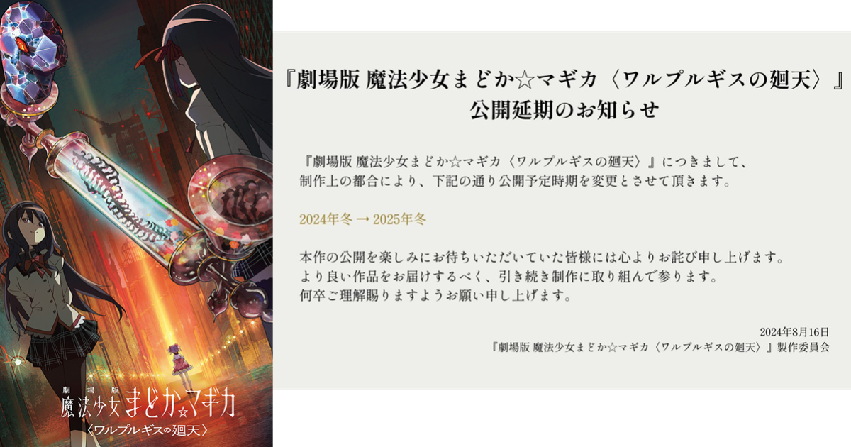 沒想到在今日 ( 8/16 ) 傍晚,官方傳來噩耗,新作劇場版《魔法少女小圓 瓦爾普吉斯之迴天》(暫譯,劇場版 魔法少女まどか☆マギカ 〈ワルプルギスの廻天〉宣布延期上映,暫定延後一年到 2025 年冬季。