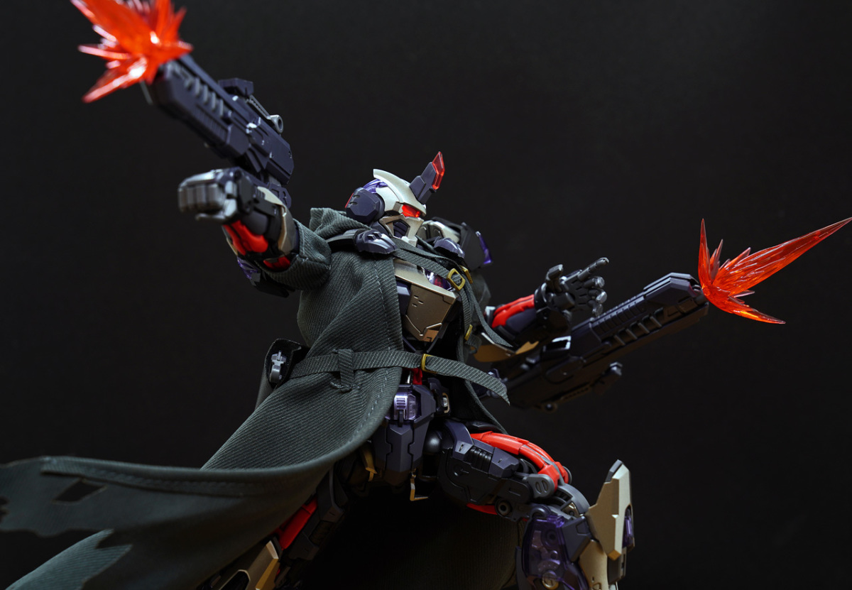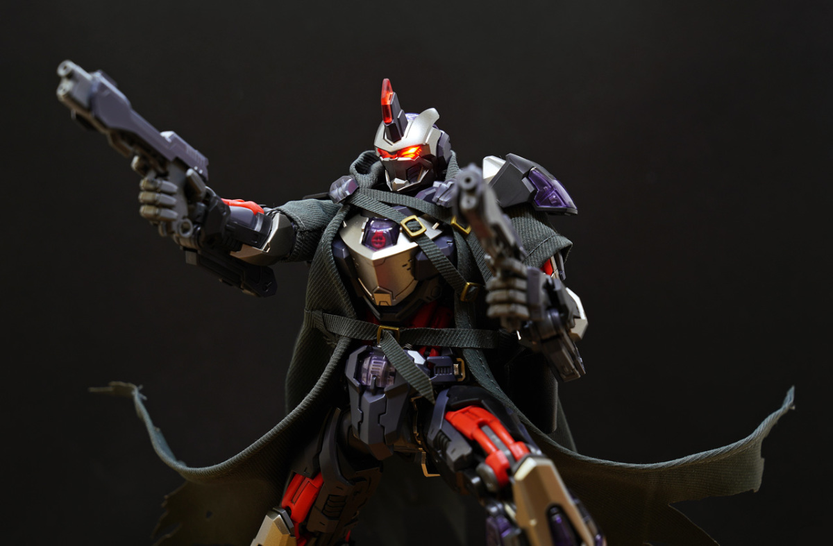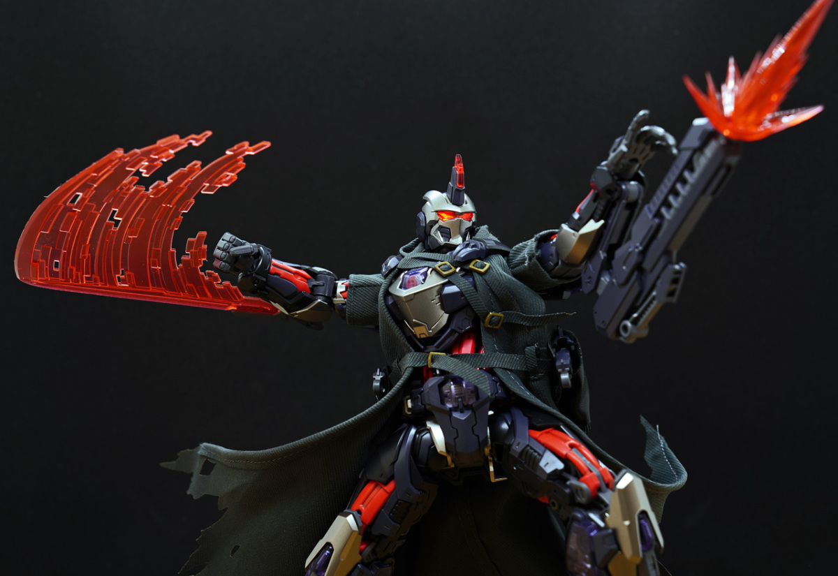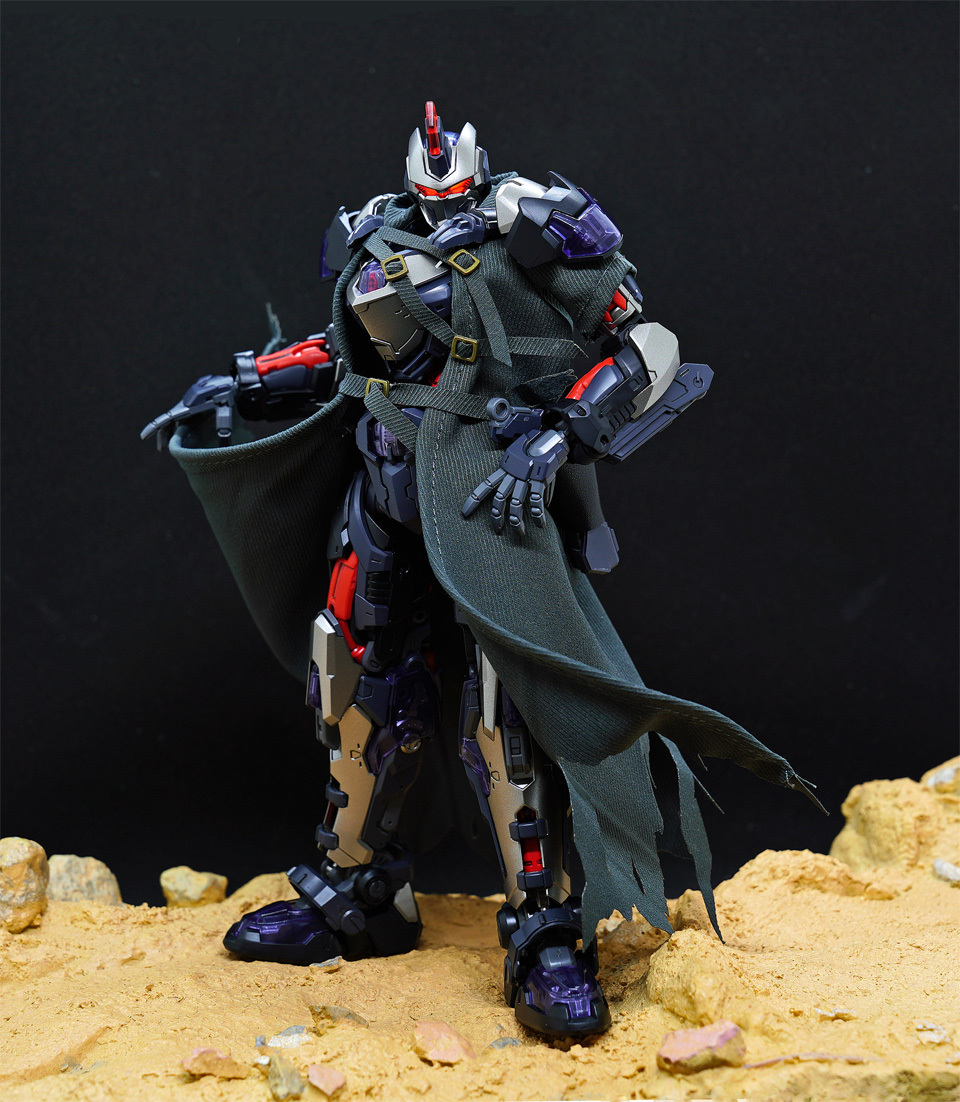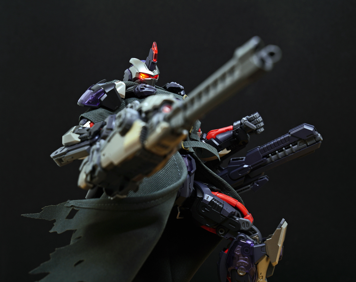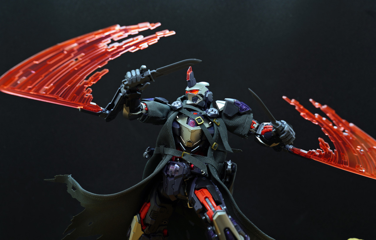 裝組方面他的技術與 Bandai 基本上沒兩樣,而肯定比壽屋及 Moderoid 更勝一籌!湯口位如果不是隱藏式的話亦盡量在一些不顯眼的地方出現。裝組時亦沒有什麼 “大力金剛指” 的情況,連骨架也用上隱藏水口這一點真是有點過份...... 零件非常細緻,基本上素組的話亦沒有什麼問題。如果花點時間渗線效果會更加吸引。開盒時你會感覺到廠方的誠意!一般模型不會有那麼多額外的東西給你,例如蝕刻片,角色貼紙,立架或其他與產品相關的附屬品...... 如果你玩一般模型通常只會得一份說明書及水貼,這一點已經和成品玩具沒異樣。 然而在雞蛋裏挑骨頭的情況下,我覺得廠商可以留意以下幾樣東西:說明書內台座組件編號有小問題;頭部著燈開關組件接觸位置需要改善;另外如果肩關節橫軸加長少許,在著上斗篷的情況之下兩肩接合會更加牢固!