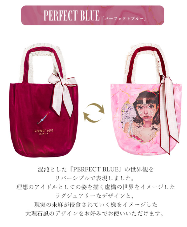 另一面則以粉紅色為基調,將電影主視覺圖融入在包包的外觀上,MAYLA 招牌的緞帶,採用劇中「未麻的房間」的網站背景來呈現,種種具有作品的世界觀藏在細節裏頭。