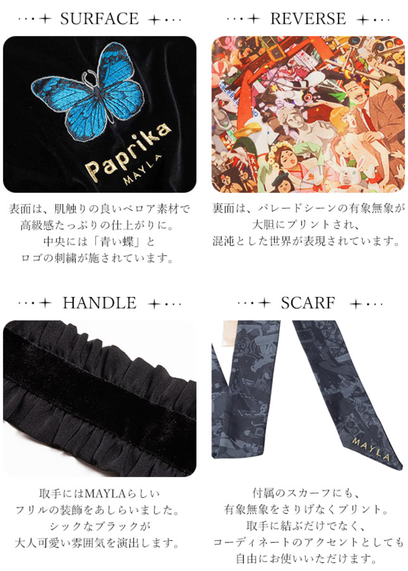 素面採用全黑色的天鵝絨質料,呈現出高貴的氣質感,搭配代表作品的刺繡蝴蝶圖案 & 作品名稱配置在中間,提帶還用黑色的摺邊裝飾來呈現。