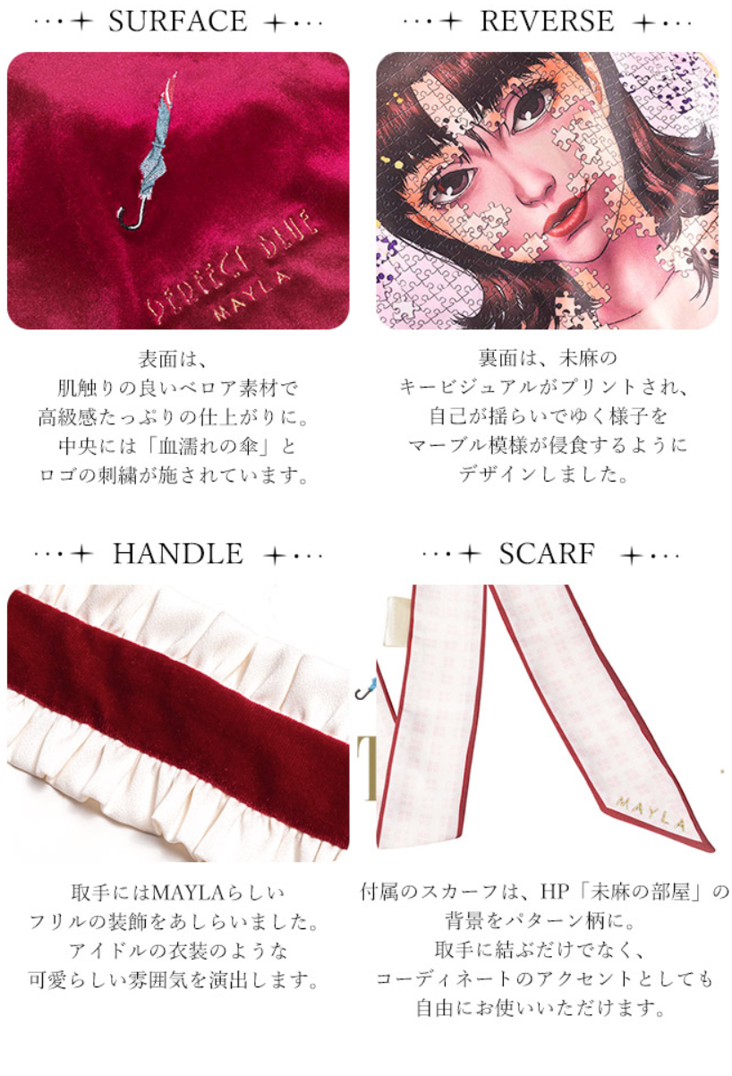 雙面為截然不同的風貌,紅色素面款以主角霧越未麻在偶像團體「CHAM!」中穿著的偶像服為靈感,提帶還用上衣服上的摺邊裝飾來呈現,中心則刺繡了劇中「染血的傘」當作點綴。