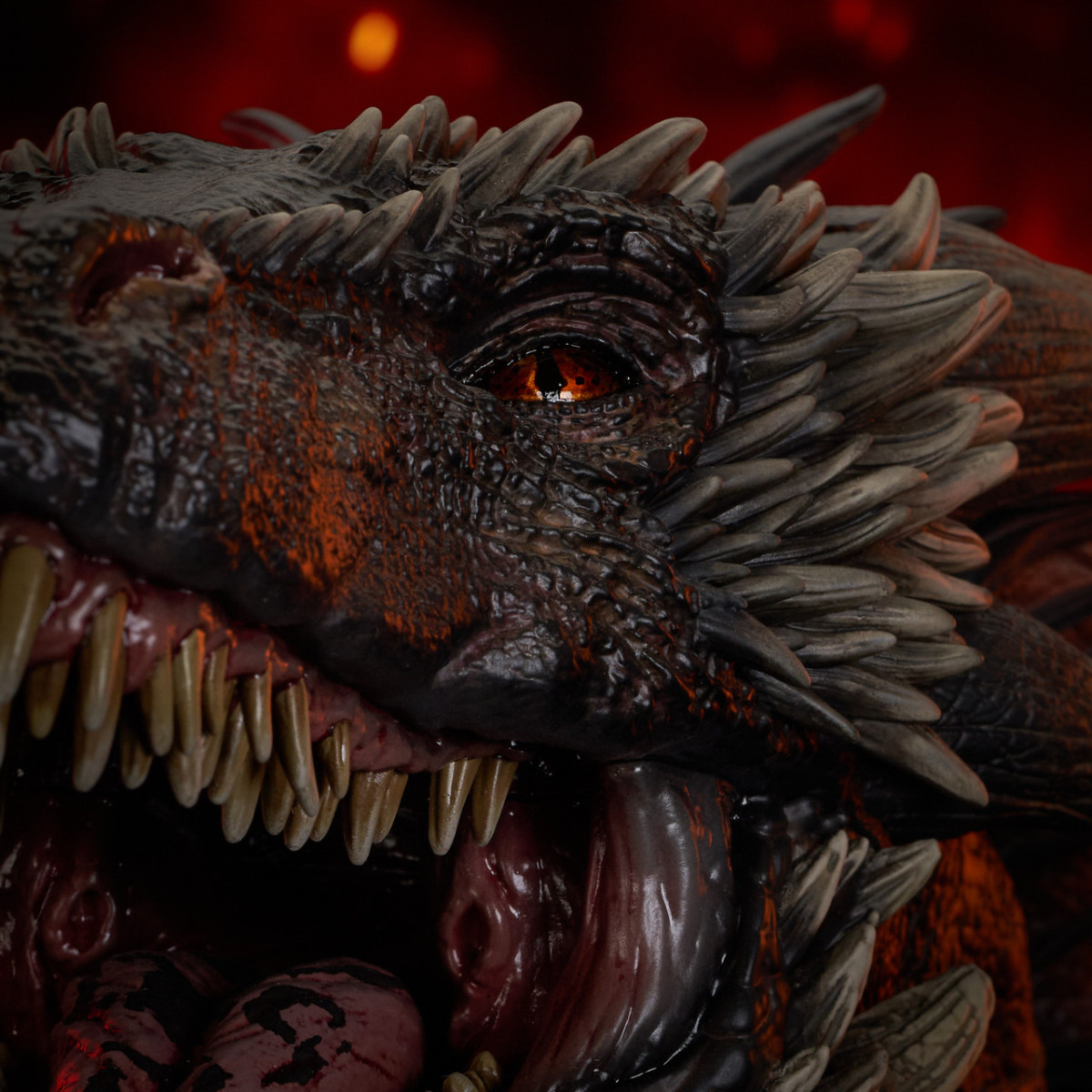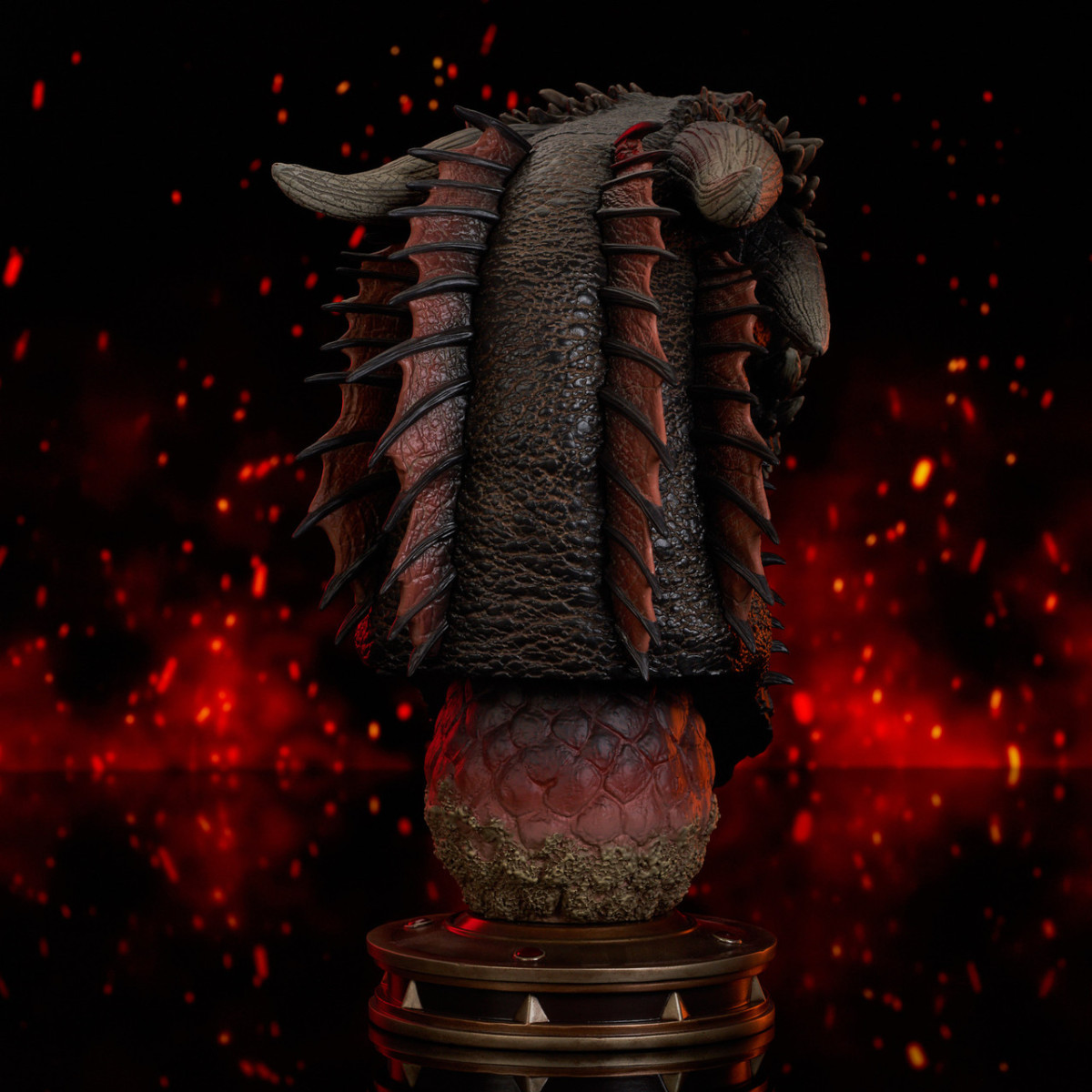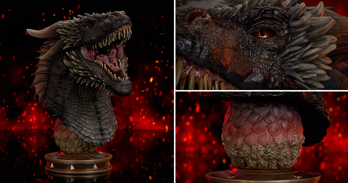 DST 本次選擇以 1/2 的大比例來製作這條令人畏懼的惡龍,全高來到 12 吋(約 30 公分),以高度造型水準刻畫出卓耿極具生物感的頭部與脖子,粗糙的體表、四根巨型的犄角、遍佈雙眼後方與下顎的密集尖刺,以及層層堆疊的鱗片、背鰭......等細節都十分精美,威懾力十足的雙眼、口內的描繪也相當逼真,加上呼應劇中元素的龍蛋底座,整體真的超級帥。