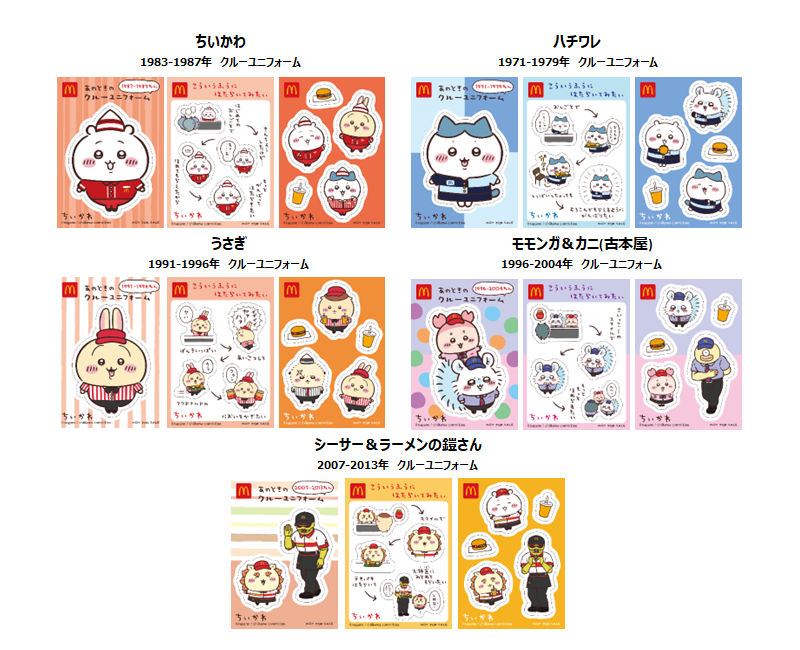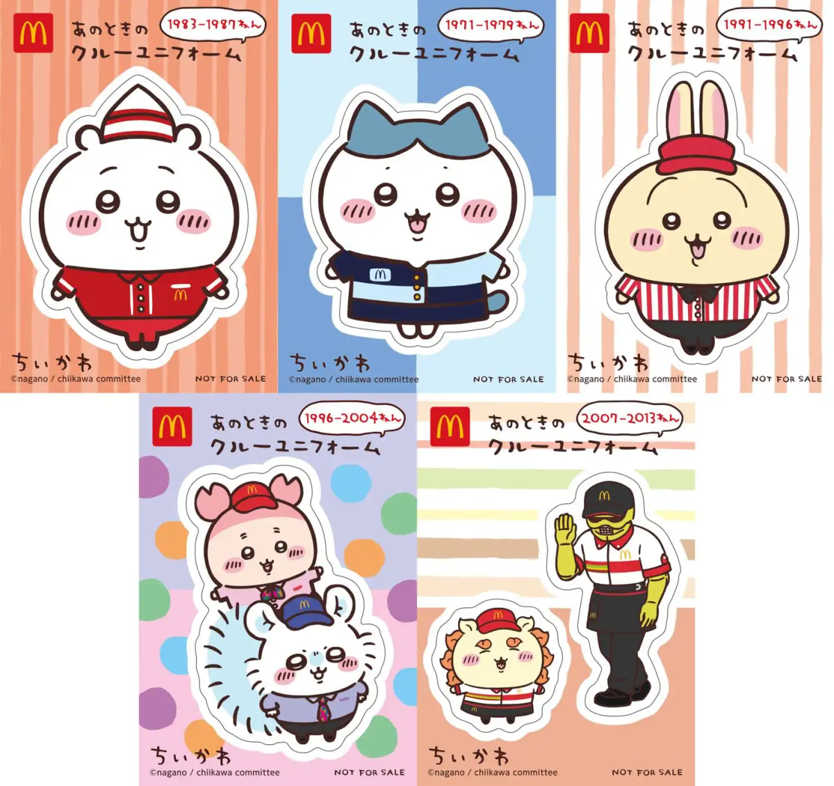 貼出的貼紙組總共有 5 款,以角色穿上麥當勞店員的制服為形象設計,且剛好為各年代不同的服裝,讓各位回憶起麥當勞的歷史的演變。