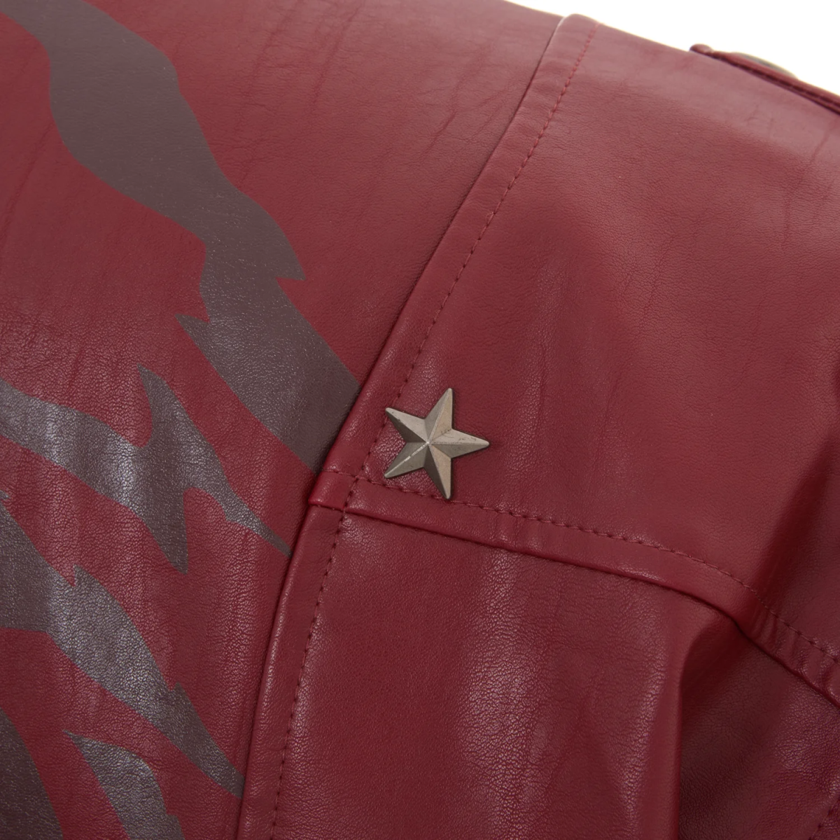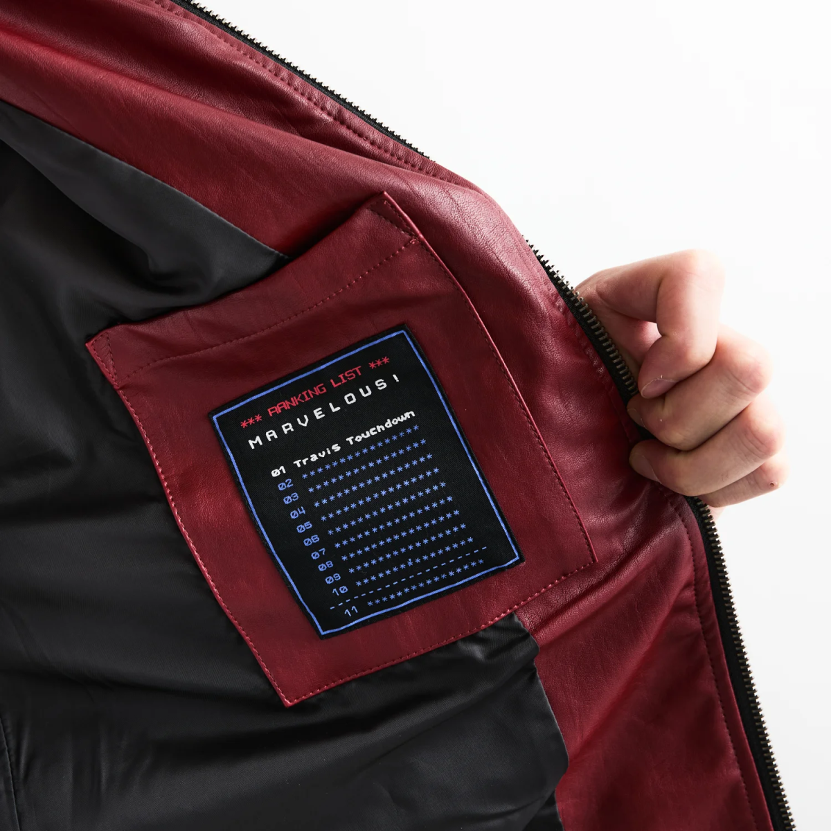 以特拉維斯愛用的紅色皮衣外套出發,完美還原的原設定的樣貌,包含背後的暗紅色虎紋,以及背面的兩個閃亮的星形飾釘。內裡口袋還配有特拉維斯登上殺手排行榜第一位的圖示細節,整體表現非常有原作的風格。