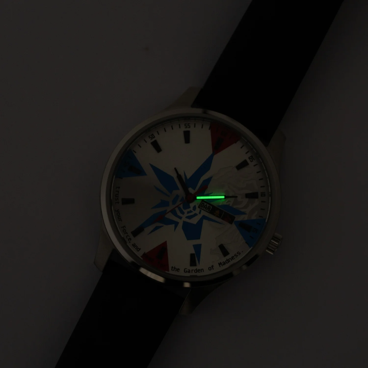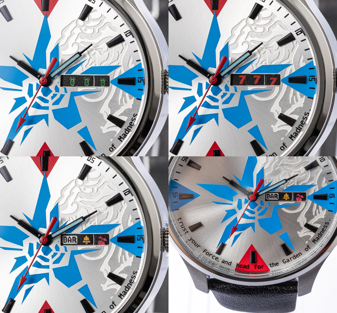 以特拉維斯愛用的手錶來呈現,錶盤設計在金屬銀色表面上以亮紅色和藍色脫穎而出,搭配老虎圖示增添了原作的特色,時針分針更採用他手持的光劍造型呈現,錶盤下方更配有他的經典名言「trust your Force, and head for the Garden of Madness.」。